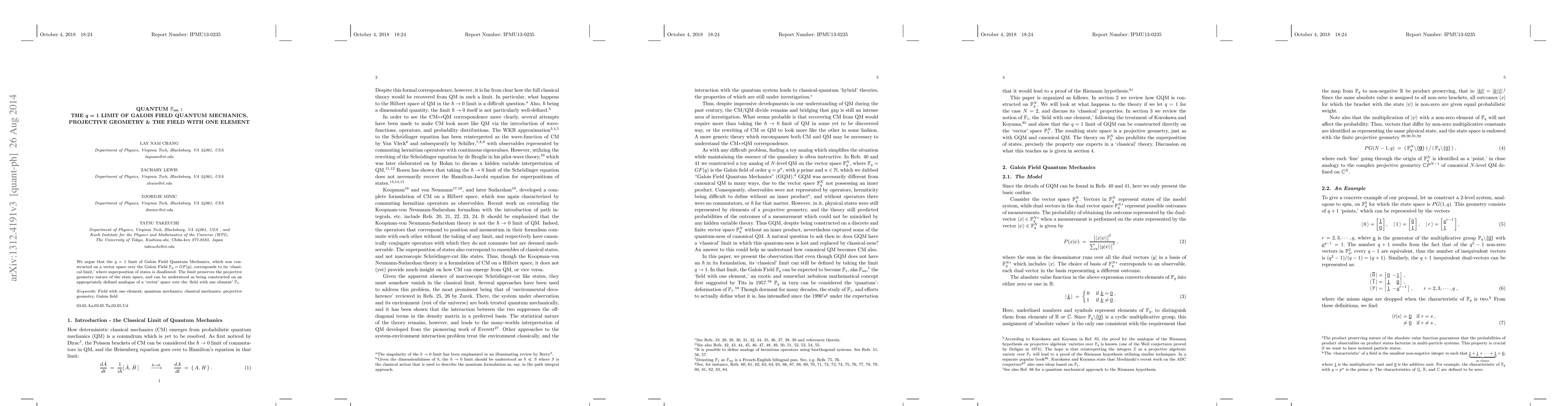 This paper explores the q=1 limit of Galois Field Quantum Mechanics, demonstrating that it corresponds to a classical limit where state superposition is prohibited. The study shows that this limit maintains the projective geometry of the state space and is built on a vector space analogue over the "field with one element" F_1.