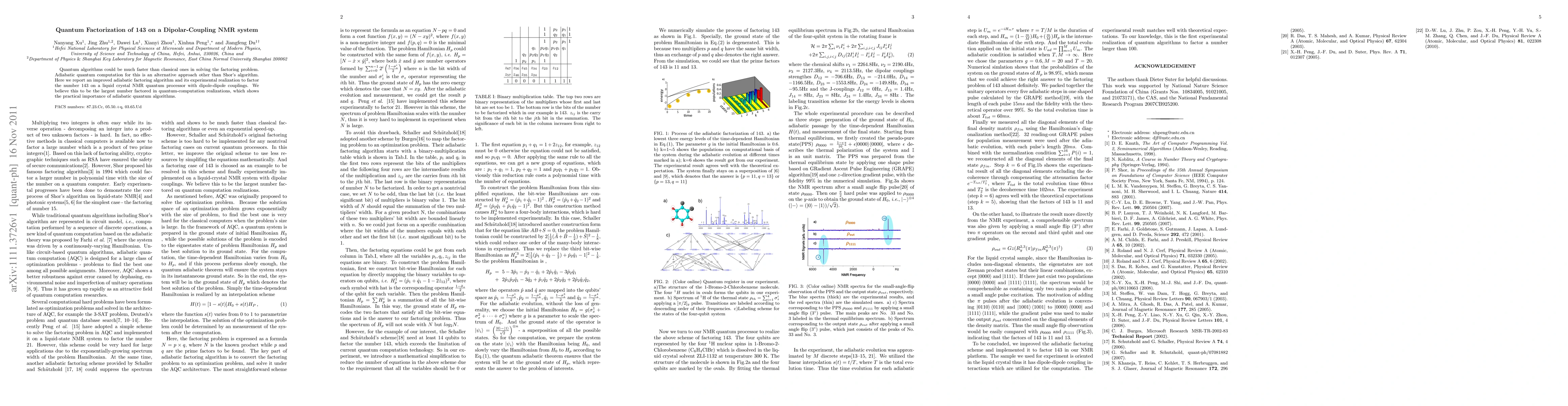 This paper presents an improved adiabatic quantum computation algorithm for factoring the number 143, demonstrating its experimental realization on a liquid crystal NMR quantum processor. This marks the largest number factored in quantum-computation demonstrations, highlighting the practical potential of adiabatic quantum algorithms.