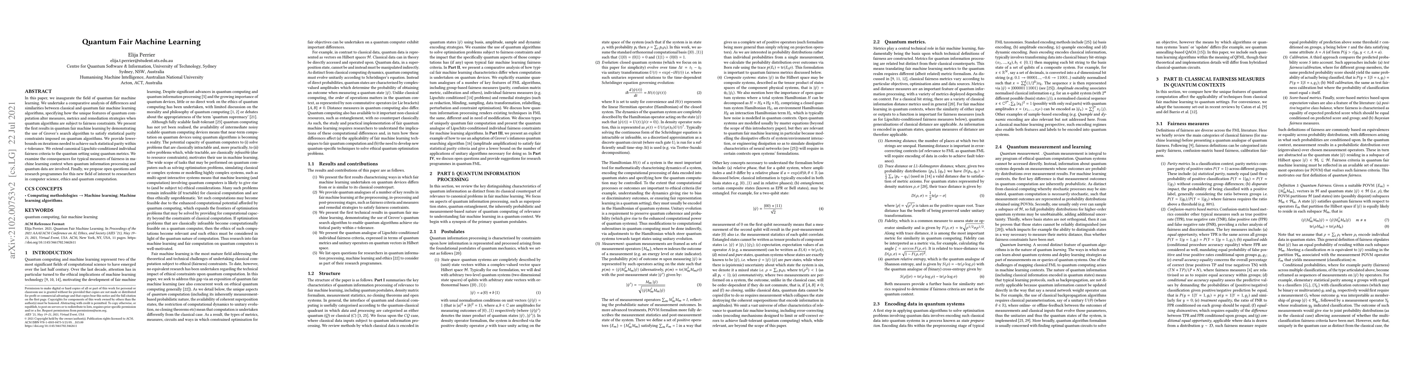 In this paper, we inaugurate the field of quantum fair machine learning. We undertake a comparative analysis of differences and similarities between classical and quantum fair machine learning algorithms, specifying how the unique features of quantum computation alter measures, metrics and remediation strategies when quantum algorithms are subject to fairness constraints. We present the first results in quantum fair machine learning by demonstrating the use of Grover's search algorithm to satisfy statistical parity constraints imposed on quantum algorithms. We provide lower-bounds on iterations needed to achieve such statistical parity within $\epsilon$-tolerance. We extend canonical Lipschitz-conditioned individual fairness criteria to the quantum setting using quantum metrics. We examine the consequences for typical measures of fairness in machine learning context when quantum information processing and quantum data are involved. Finally, we propose open questions and research programmes for this new field of interest to researchers in computer science, ethics and quantum computation.