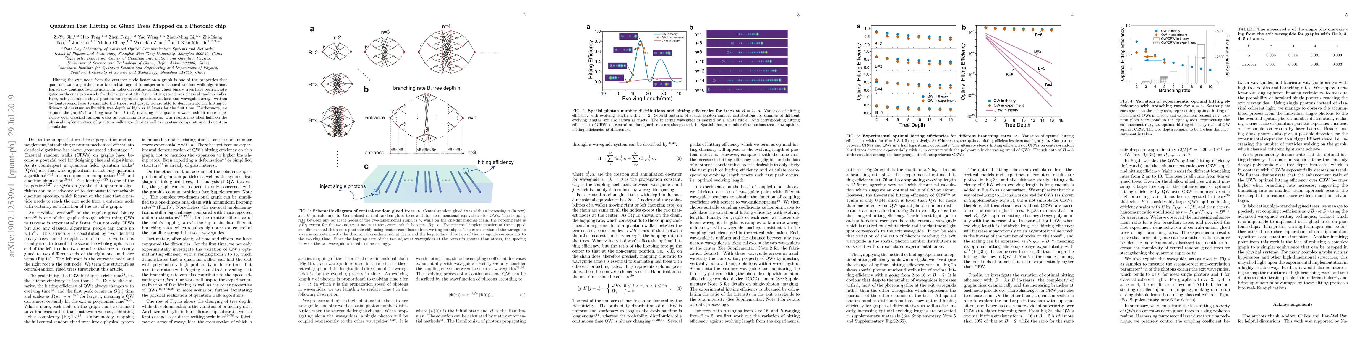 This paper demonstrates the hitting efficiency of continuous-time quantum walks on glued binary trees mapped onto a photonic chip using heralded single photons. The study shows that quantum walks outperform classical random walks, especially as the branching rate increases, suggesting potential for quantum computation and simulation.