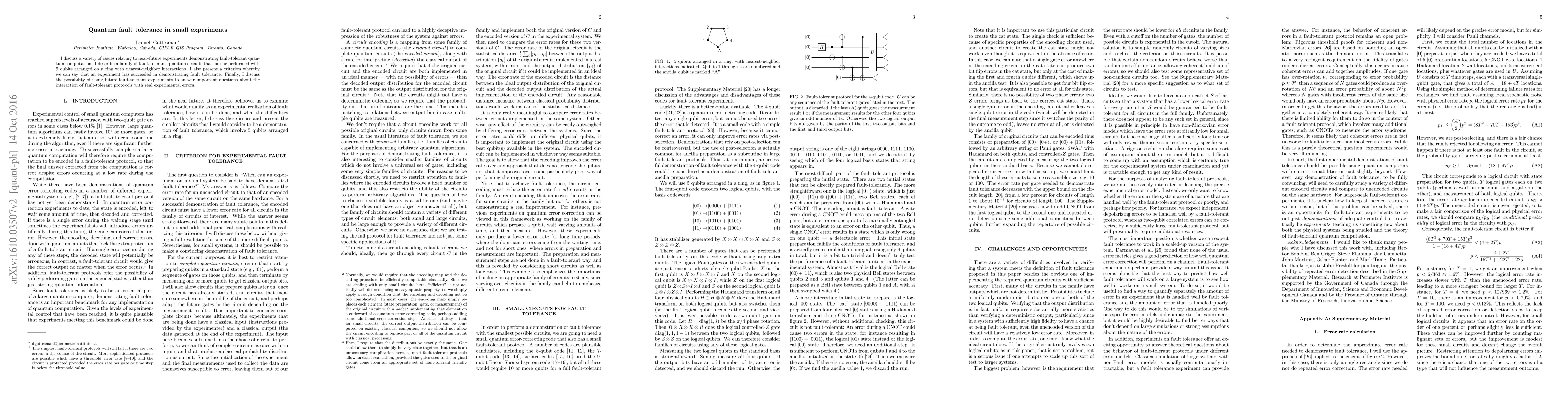 This paper explores fault-tolerant quantum computation in small-scale experiments, detailing a family of quantum circuits using 5 qubits arranged in a ring. It also proposes a criterion for determining successful demonstration of fault tolerance and considers how future experiments can address real-world errors in fault-tolerant protocols.