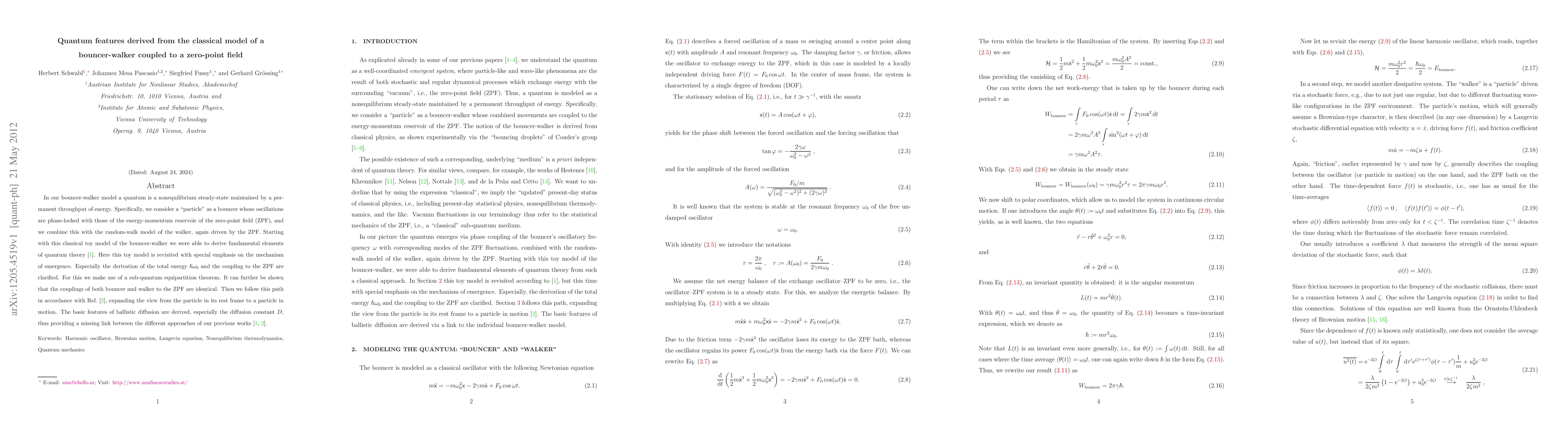 This paper revisits a classical bouncer-walker model to derive quantum features, emphasizing the emergence mechanism and the derivation of total energy hbar.ω. It uses a sub-quantum equipartition theorem to show identical couplings to the zero-point field, extending the model to particles in motion and deriving ballistic diffusion constants.