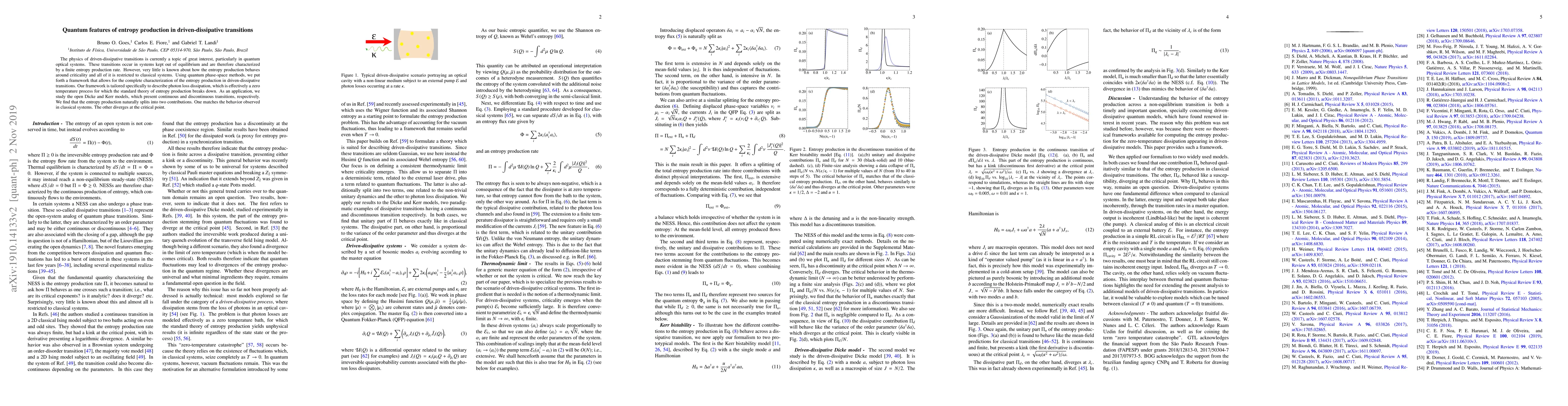This paper develops a quantum framework for characterizing entropy production in driven-dissipative transitions, particularly in quantum optical systems with photon loss dissipation. It reveals that entropy production splits into two parts: one consistent with classical systems and another diverging at the critical point.