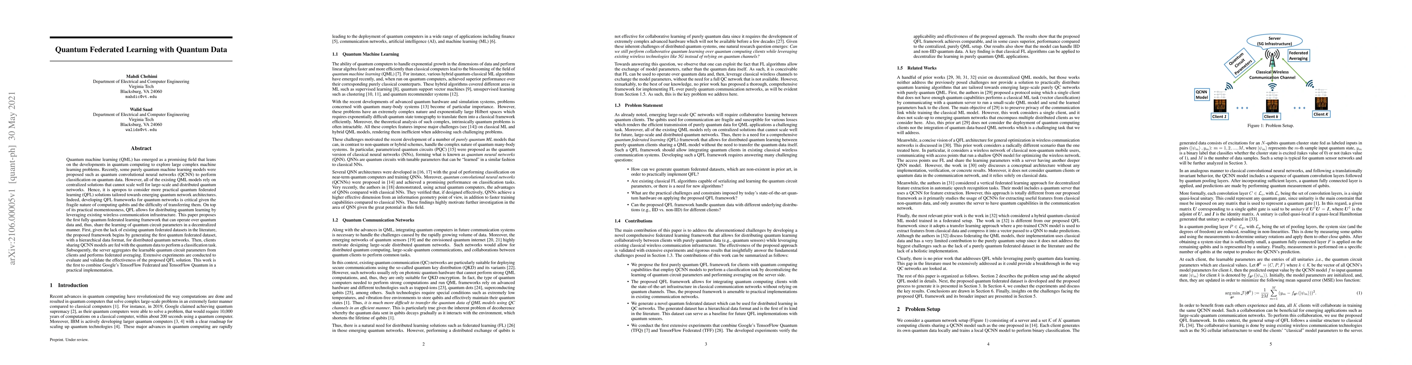 Quantum machine learning (QML) has emerged as a promising field that leans on the developments in quantum computing to explore large complex machine learning problems. Recently, some purely quantum machine learning models were proposed such as the quantum convolutional neural networks (QCNN) to perform classification on quantum data. However, all of the existing QML models rely on centralized solutions that cannot scale well for large-scale and distributed quantum networks. Hence, it is apropos to consider more practical quantum federated learning (QFL) solutions tailored towards emerging quantum network architectures. Indeed, developing QFL frameworks for quantum networks is critical given the fragile nature of computing qubits and the difficulty of transferring them. On top of its practical momentousness, QFL allows for distributed quantum learning by leveraging existing wireless communication infrastructure. This paper proposes the first fully quantum federated learning framework that can operate over quantum data and, thus, share the learning of quantum circuit parameters in a decentralized manner. First, given the lack of existing quantum federated datasets in the literature, the proposed framework begins by generating the first quantum federated dataset, with a hierarchical data format, for distributed quantum networks. Then, clients sharing QCNN models are fed with the quantum data to perform a classification task. Subsequently, the server aggregates the learnable quantum circuit parameters from clients and performs federated averaging. Extensive experiments are conducted to evaluate and validate the effectiveness of the proposed QFL solution. This work is the first to combine Google's TensorFlow Federated and TensorFlow Quantum in a practical implementation.