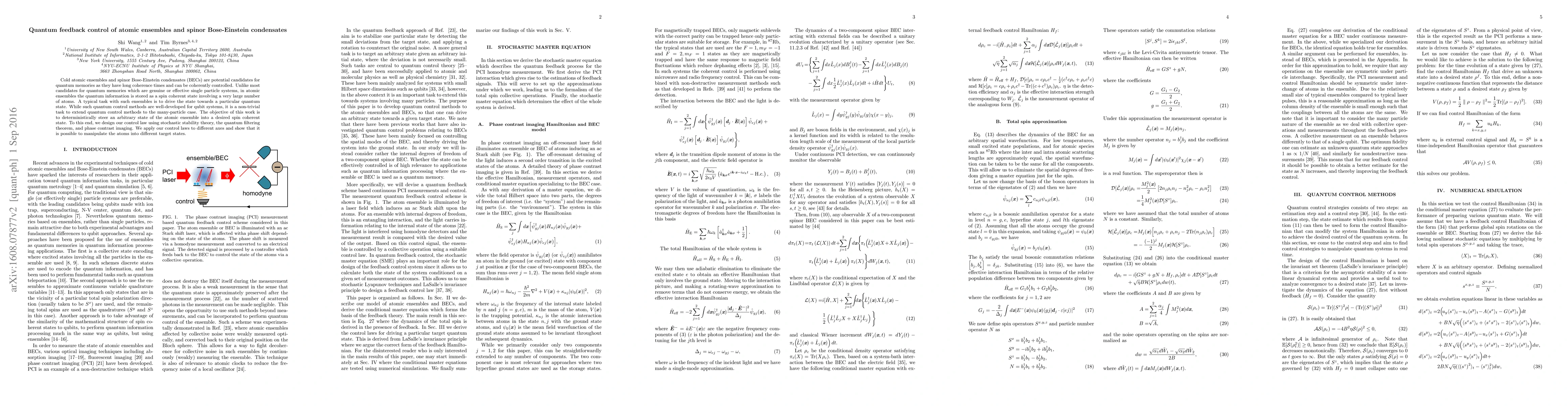 This paper develops quantum feedback control methods to deterministically steer atomic ensembles and spinor Bose-Einstein condensates into desired spin coherent states, utilizing stochastic stability theory, quantum filtering, and phase contrast imaging. The approach demonstrates successful manipulation of atoms into target states across different axes.