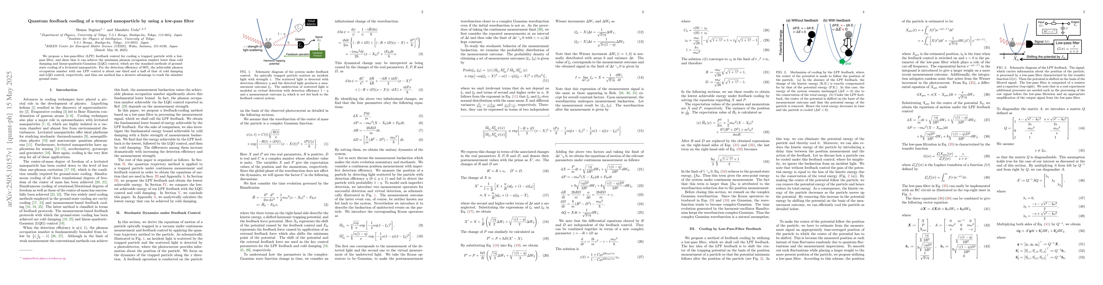 The research proposes a low-pass-filter (LPF) feedback control for cooling a trapped nanoparticle, comparing its performance with standard methods like cold damping and linear-quadratic-Gaussian (LQG) control.