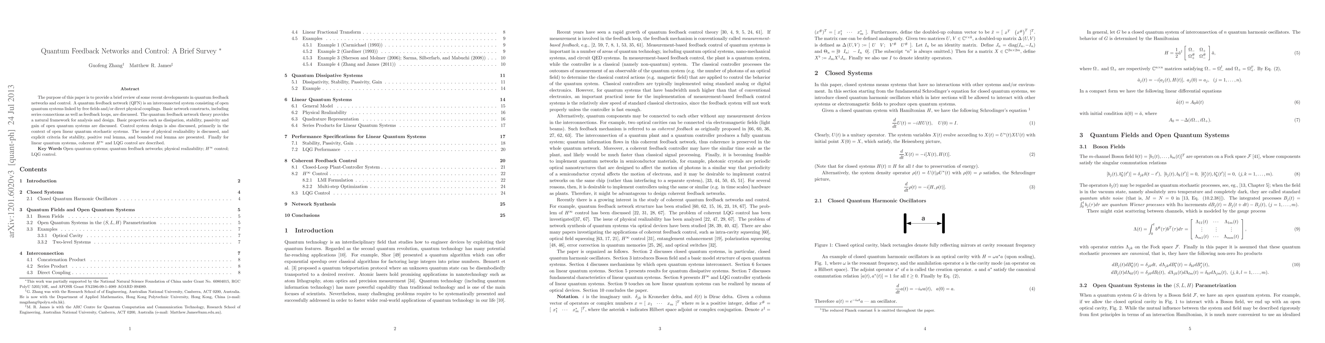 This paper reviews recent advances in quantum feedback networks, discussing interconnected quantum systems and their properties, including stability and control designs, alongside criteria for stability and realizability in linear quantum systems. It also covers $H^\infty$ and LQG control methods for linear quantum systems.