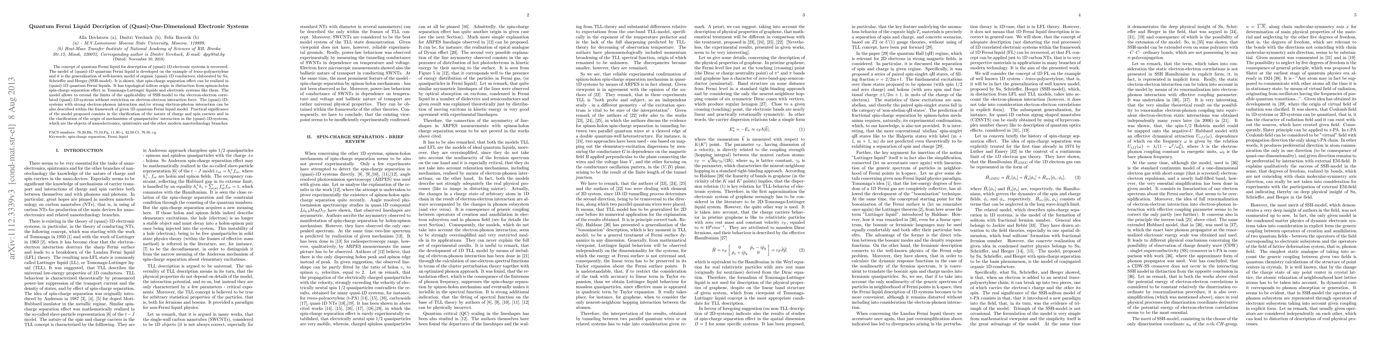 This paper develops a quantum Fermi liquid model for (quasi)-1D electronic systems, exemplified by trans-polyacetylene, extending the SSH-model to include electron-electron correlations. It highlights the topological soliton origin of spin-charge separation, distinguishing it from Tomonaga-Luttinger liquids, and has practical implications for understanding charge and spin carriers in nanoelectronics and spintronics.
