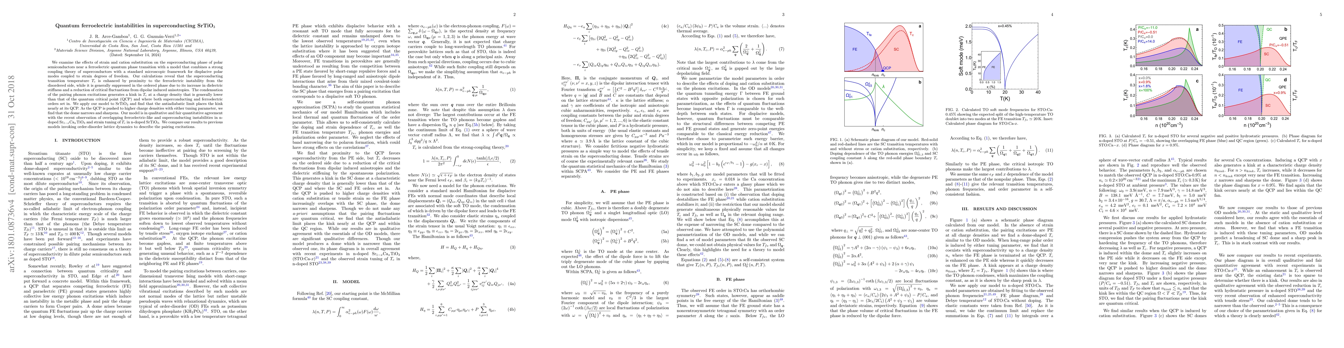 We examine the effects of strain and cation substitution on the superconducting phase of polar semiconductors near a ferroelectric quantum phase transition with a model that combines a strong coupling theory of superconductors with a standard microscopic framework for displacive polar modes coupled to strain degrees of freedom. Our calculations reveal that the superconducting transition temperature $T_c$ is enhanced by proximity to the ferroelectric instability from the disordered side, while it is generally suppressed in the ordered phase due to its increase in dielectric stiffness and a reduction of critical fluctuations from dipolar induced anisotropies. The condensation of the pairing phonon excitations generates a kink in $T_c$ at a charge density that is generally lower than that of the quantum critical point (QCP) and where both superconducting and ferroeletric orders set-in. We apply our model to SrTiO$_3$ and find that the anti-adiabatic limit places the kink nearly at its QCP. As the QCP is pushed to higher charge densities with either tuning parameter, we find that the dome narrows and sharpens. Our model is in qualitatively and fair quantitatively agreement with the recent observation of overlapping ferroelectric-like and superconducting instabilities in n-doped Sr$_{1-x}$Ca$_x$TiO$_3$ and strain tunning of $T_c$ in n-doped SrTiO$_3$. We compare our results to previous models invoking order-disorder lattice dynamics to describe the pairing excitations.