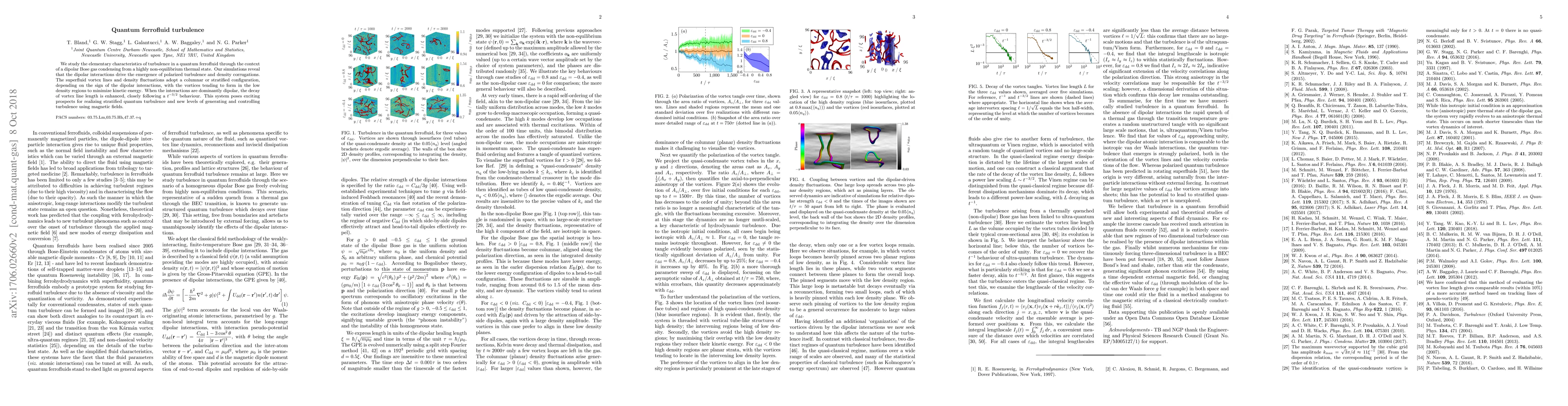 We study the elementary characteristics of turbulence in a quantum ferrofluid through the context of a dipolar Bose gas condensing from a highly non-equilibrium thermal state. Our simulations reveal that the dipolar interactions drive the emergence of polarized turbulence and density corrugations. The superfluid vortex lines and density fluctuations adopt a columnar or stratified configuration, depending on the sign of the dipolar interactions, with the vortices tending to form in the low density regions to minimize kinetic energy. When the interactions are dominantly dipolar, the decay of vortex line length is enhanced, closely following a $t^{-3/2}$ behaviour. This system poses exciting prospects for realizing stratified quantum turbulence and new levels of generating and controlling turbulence using magnetic fields.