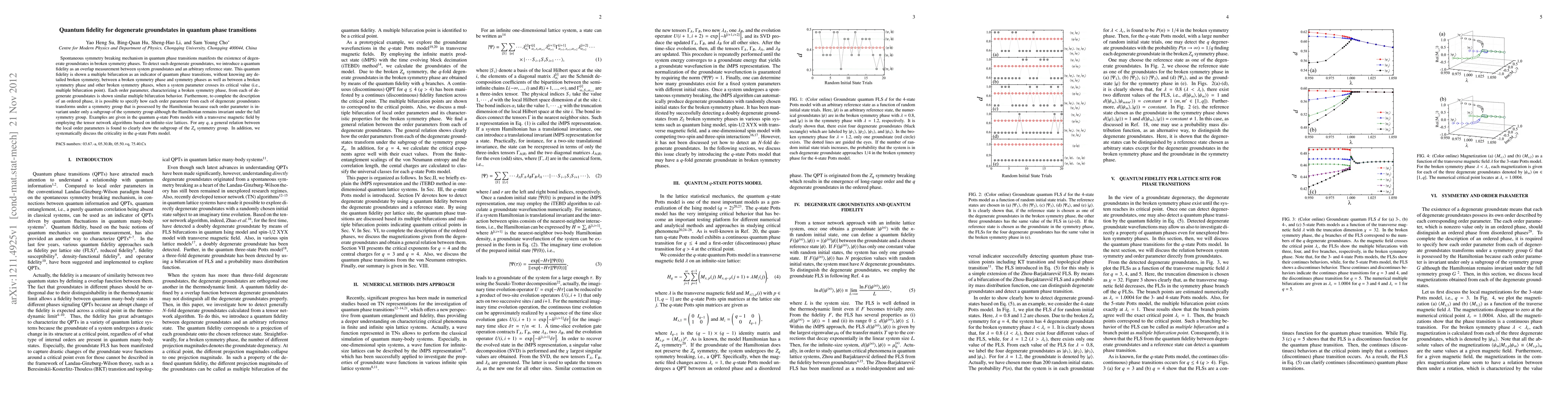 This paper introduces quantum fidelity as a method to detect degenerate groundstates in quantum phase transitions, showing multiple bifurcations as an indicator of these transitions. It also explores how order parameters transform under symmetry groups, illustrated through tensor network algorithms applied to the $q$-state Potts models.