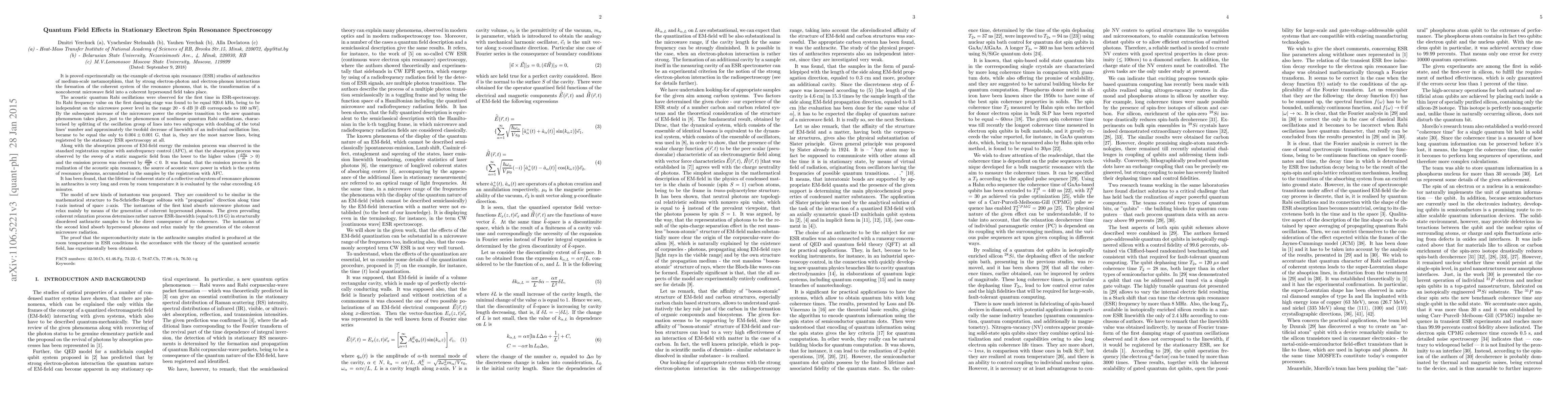 It is proved on the example of electron spin resonance (ESR) studies of anthracites, that by strong electron-photon and electron-phonon interactions the formation of the coherent system of the resonance phonons takes place. The acoustic quantum Rabi oscillations were observed for the first time in ESR-spectroscopy. Its Rabi frequency value on the first damping stage was found to be equal 920.6 kHz, being to be independent on the microwave power level in the range 20 - 6 dB [0 dB corresponds to 100 mW]. By the subsequent increase of the microwave power the stepwise transition to the phenomenon of nonlinear quantum Rabi oscillations, characterised by splitting of the oscillation group of lines into two subgroups with doubling of the total lines' number takes place. Linewidth of an individual oscillation line becomes approximately the twofold narrower, being to be equal the only to $0.004 \pm 0.001$ G. Along with the absorption process of EM-field energy the emission process was observed. It was found, that the emission process is the realization of the acoustic spin resonance, the source of acoustic wave power in which is the system of resonance phonons, accumulated in the samples by the registration with AFC. It has been found, that the lifetime of coherent state of a collective subsystem of resonance phonons in anthracites is very long and even by room temperature it is evaluated by the value exceeding 4.6 minutes. The model of new kinds of instantons was proposed. They are considered to be similar in the mathematical structure to Su-Schrieffer-Heeger solitons with "propagation" direction along time $t$-axis instead of space $z$-axis. The proof, that the superconductivity state in the anthracite samples studied is produced at the room temperature in ESR conditions in the accordance with the theory of the quantised acoustic field, has experimentally been obtained.