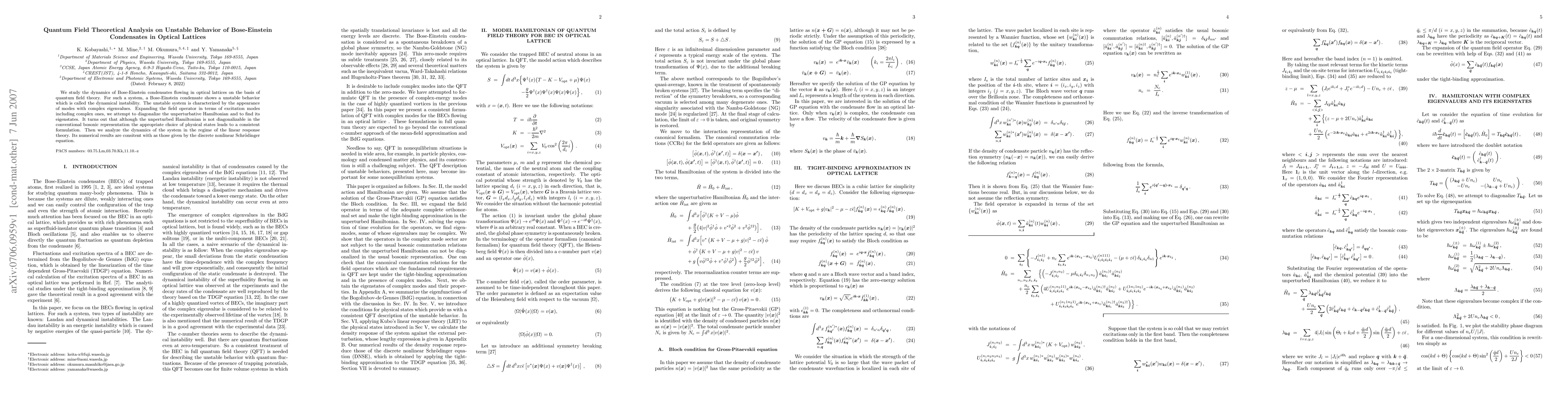 We study the dynamics of Bose-Einstein condensates flowing in optical lattices on the basis of quantum field theory. For such a system, a Bose-Einstein condensate shows a unstable behavior which is called the dynamical instability. The unstable system is characterized by the appearance of modes with complex eigenvalues. Expanding the field operator in terms of excitation modes including complex ones, we attempt to diagonalize the unperturbative Hamiltonian and to find its eigenstates. It turns out that although the unperturbed Hamiltonian is not diagonalizable in the conventional bosonic representation the appropriate choice of physical states leads to a consistent formulation. Then we analyze the dynamics of the system in the regime of the linear response theory. Its numerical results are consitent with as those given by the discrete nonlinear Schrodinger equation.