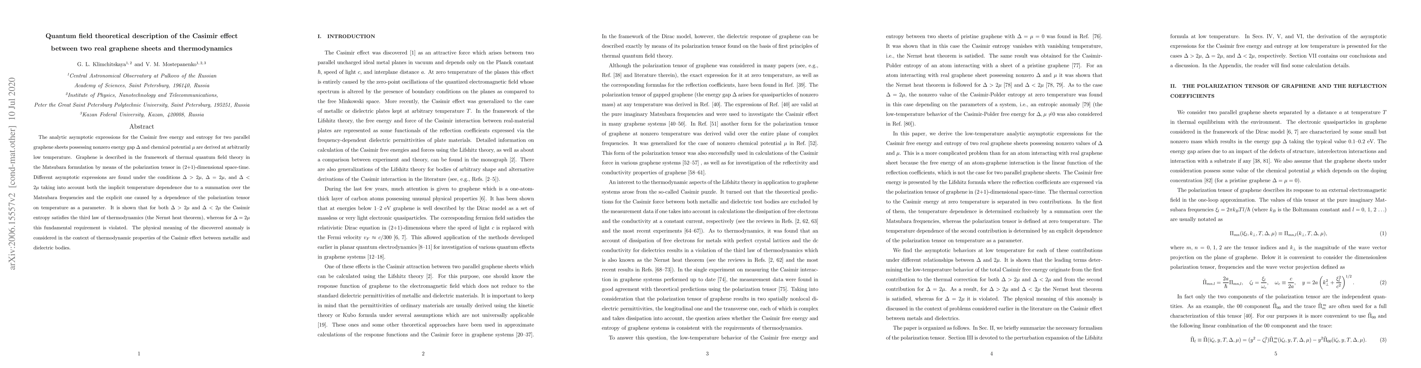 The analytic asymptotic expressions for the Casimir free energy and entropy for two parallel graphene sheets possessing nonzero energy gap $\Delta$ and chemical potential $\mu$ are derived at arbitrarily low temperature. Graphene is described in the framework of thermal quantum field theory in the Matsubara formulation by means of the polarization tensor in (2+1)-dimensional space-time. Different asymptotic expressions are found under the conditions $\Delta>2\mu$, $\Delta=2\mu$, and $\Delta<2\mu$ taking into account both the implicit temperature dependence due to a summation over the Matsubara frequencies and the explicit one caused by a dependence of the polarization tensor on temperature as a parameter. It is shown that for both $\Delta>2\mu$ and $\Delta<2\mu$ the Casimir entropy satisfies the third law of thermodynamics (the Nernst heat theorem), whereas for $\Delta=2\mu$ this fundamental requirement is violated. The physical meaning of the discovered anomaly is considered in the context of thermodynamic properties of the Casimir effect between metallic and dielectric bodies.
