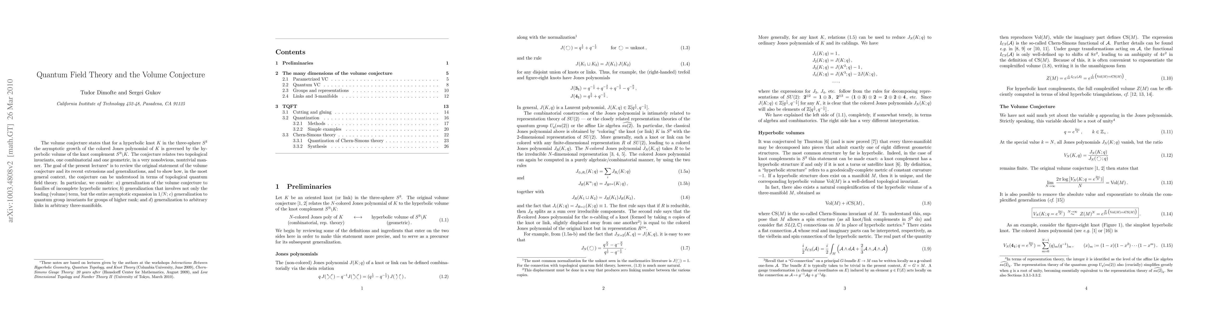 The volume conjecture states that for a hyperbolic knot K in the three-sphere S^3 the asymptotic growth of the colored Jones polynomial of K is governed by the hyperbolic volume of the knot complement S^3\K. The conjecture relates two topological invariants, one combinatorial and one geometric, in a very nonobvious, nontrivial manner. The goal of the present lectures is to review the original statement of the volume conjecture and its recent extensions and generalizations, and to show how, in the most general context, the conjecture can be understood in terms of topological quantum field theory. In particular, we consider: a) generalization of the volume conjecture to families of incomplete hyperbolic metrics; b) generalization that involves not only the leading (volume) term, but the entire asymptotic expansion in 1/N; c) generalization to quantum group invariants for groups of higher rank; and d) generalization to arbitrary links in arbitrary three-manifolds.