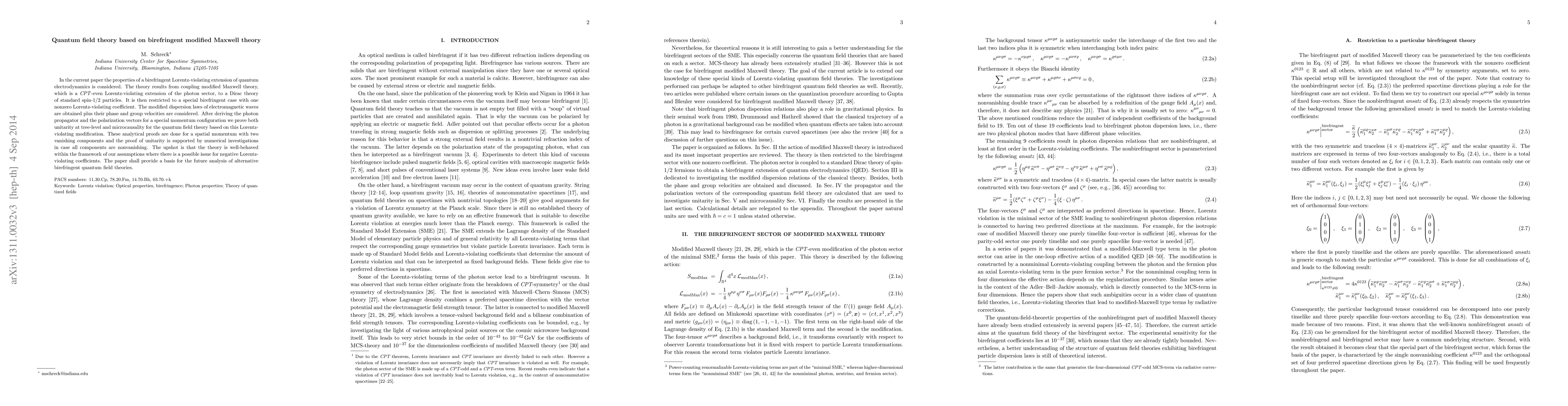 In the current paper the properties of a birefringent Lorentz-violating extension of quantum electrodynamics is considered. The theory results from coupling modified Maxwell theory, which is a CPT-even Lorentz-violating extension of the photon sector, to a Dirac theory of standard spin-1/2 particles. It is then restricted to a special birefringent case with one nonzero Lorentz-violating coefficient. The modified dispersion laws of electromagnetic waves are obtained plus their phase and group velocities are considered. After deriving the photon propagator and the polarization vectors for a special momentum configuration we prove both unitarity at tree-level and microcausality for the quantum field theory based on this Lorentz-violating modification. These analytical proofs are done for a spatial momentum with two vanishing components and the proof of unitarity is supported by numerical investigations in case all components are nonvanishing. The upshot is that the theory is well-behaved within the framework of our assumptions where there is a possible issue for negative Lorentz-violating coefficients. The paper shall provide a basis for the future analysis of alternative birefringent quantum field theories.
