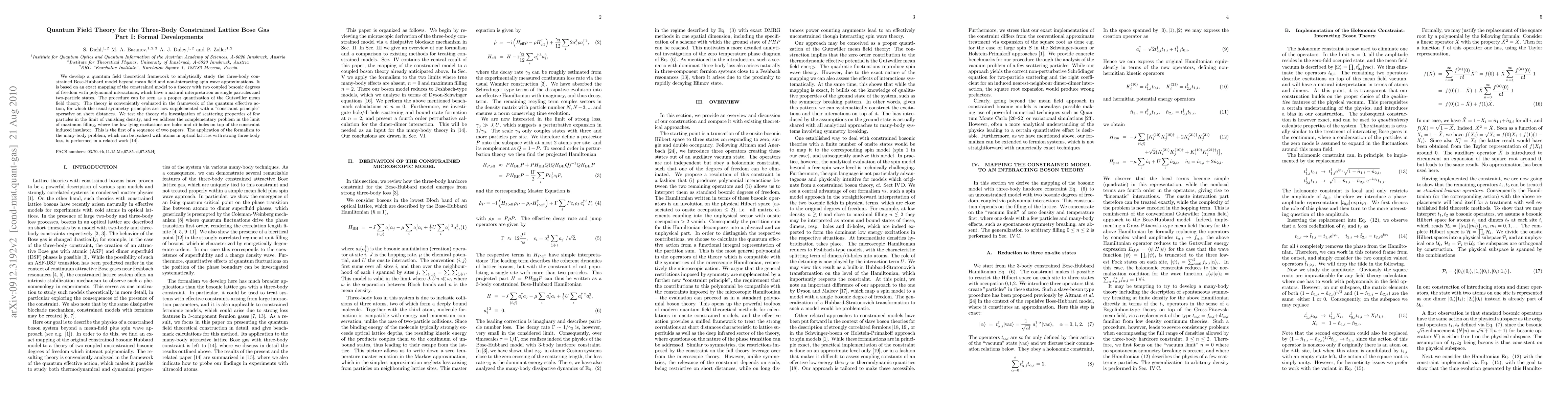 We develop a quantum field theoretical framework to analytically study the three-body constrained Bose-Hubbard model beyond mean field and non-interacting spin wave approximations. It is based on an exact mapping of the constrained model to a theory with two coupled bosonic degrees of freedom with polynomial interactions, which have a natural interpretation as single particles and two-particle states. The procedure can be seen as a proper quantization of the Gutzwiller mean field theory. The theory is conveniently evaluated in the framework of the quantum effective action, for which the usual symmetry principles are now supplemented with a ``constraint principle'' operative on short distances. We test the theory via investigation of scattering properties of few particles in the limit of vanishing density, and we address the complementary problem in the limit of maximum filling, where the low lying excitations are holes and di-holes on top of the constraint induced insulator. This is the first of a sequence of two papers. The application of the formalism to the many-body problem, which can be realized with atoms in optical lattices with strong three-body loss, is performed in a related work [14].
