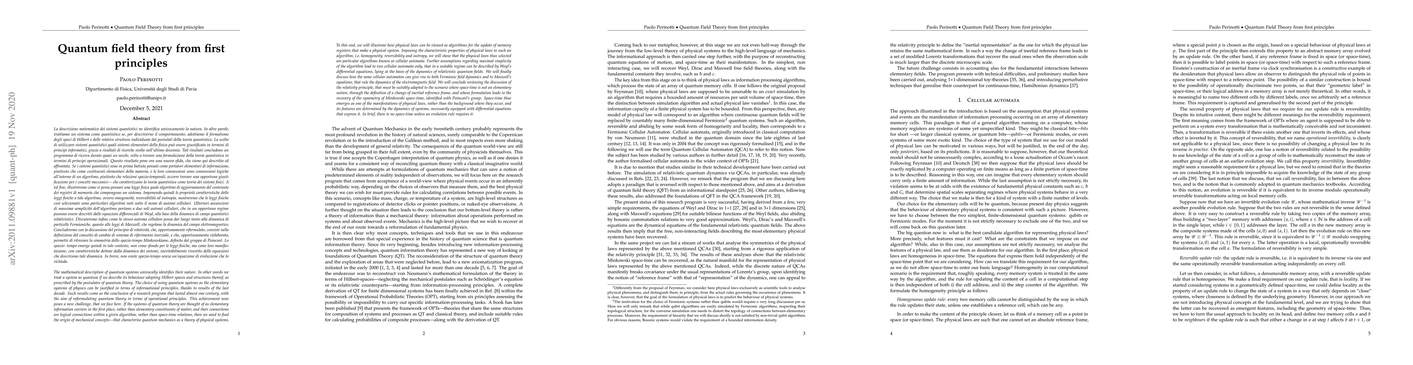 This research proposes a novel perspective on quantum field theory, viewing physical systems as elementary information carriers and their connections as logical algorithms. It demonstrates that physical laws can be represented as cellular automata, simplifying to Weyl's differential equations governing relativistic quantum fields. The study also shows how the same automaton can describe both Fermionic and electromagnetic field dynamics, with space-time emerging from these laws rather than preceding them. The paper redefines the relativity principle for this context, preserving Minkowski space-time symmetry through Poincaré's group.