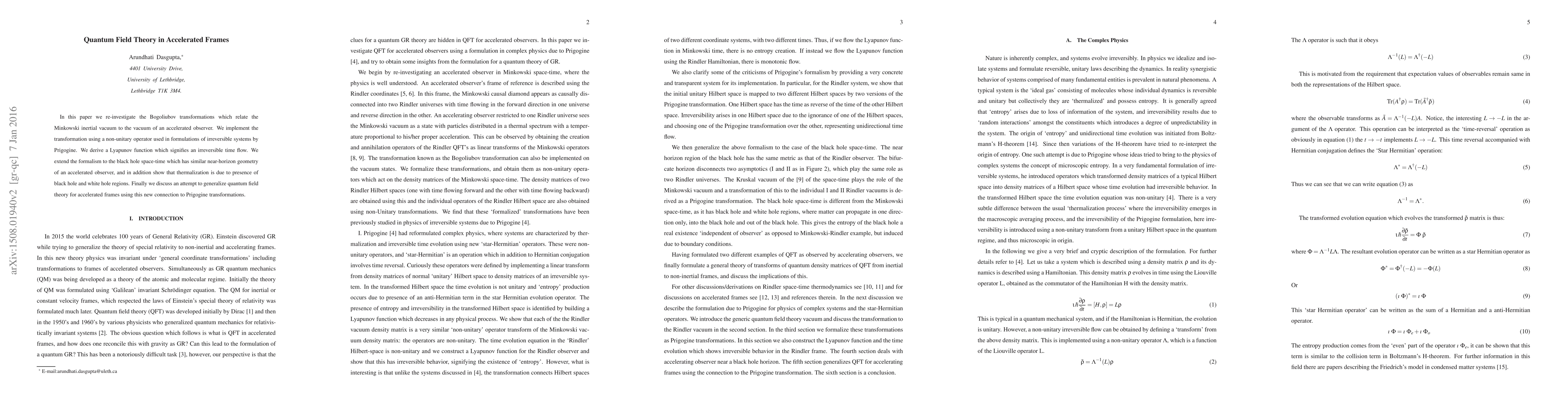 In this paper we re-investigate the Bogoliubov transformations which relate the Minkowski inertial vacuum to the vacuum of an accelerated observer. We implement the transformation using a non-unitary operator used in formulations of irreversible systems by Prigogine. We derive a Lyapunov function which signifies an irreversible time flow. We extend the formalism to the black hole space-time which has similar near-horizon geometry of an accelerated observer, and in addition show that thermalization is due to presence of black hole and white hole regions. Finally we discuss an attempt to generalize quantum field theory for accelerated frames using this new connection to Prigogine transformations.