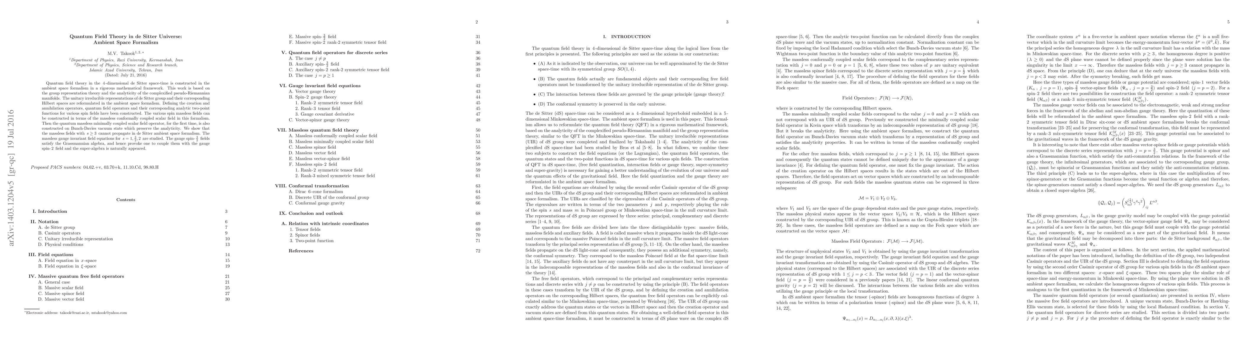 Quantum field theory in the $4$-dimensional de Sitter space-time is constructed in the ambient space formalism in a rigorous mathematical framework. This work is based on the group representation theory and the analyticity of the complexified pseudo-Riemannian manifolds. The unitary irreducible representations of de Sitter group and their corresponding Hilbert spaces are reformulated in the ambient space formalism. Defining the creation and annihilation operators, quantum field operators and their corresponding analytic two-point functions for various spin fields have been constructed. The various spin massless fields can be constructed in terms of the massless conformally coupled scalar field in this formalism. Then the quantum massless minimally coupled scalar field operator, for the first time, is also constructed on Bunch-Davies vacuum state which preserve the analyticity. We show that the massless fields with $s \geq 3$ cannot propagate in de Sitter ambient space formalism. The massless gauge invariant field equations for $s=1, \frac{3}{2}, 2$ are studied. The gauge spin-$\frac{3}{2}$ fields satisfy the Grassmannian algebra, and hence provoke one to couple them with the gauge spin-$2$ field and the super-algebra is naturally appeared.