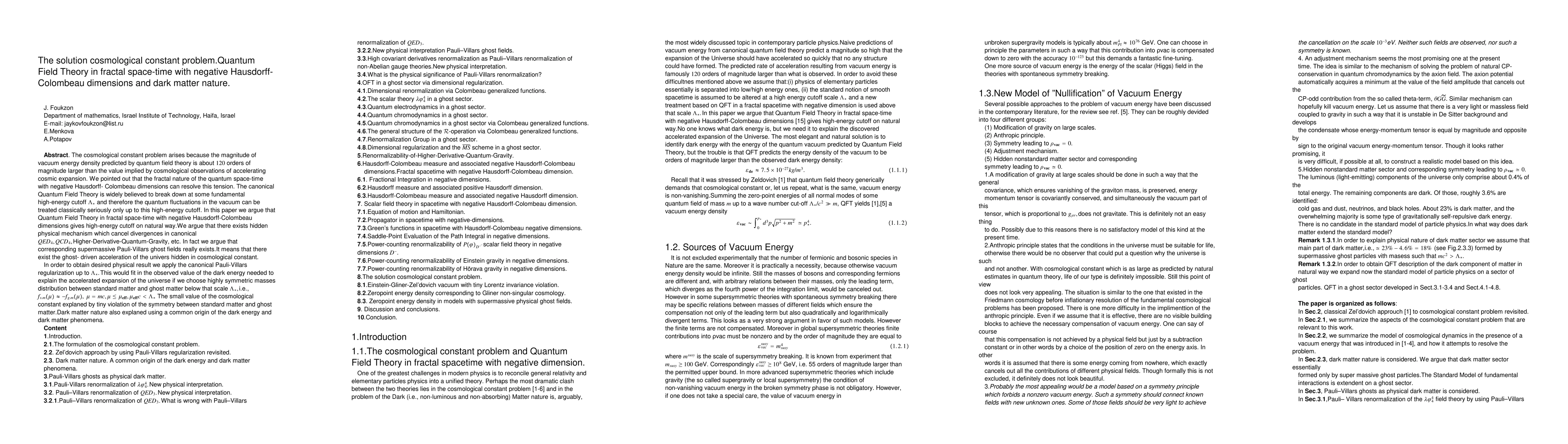 We introduce Hausdorff-Colombeau measure in respect with negative fractal dimensions. Axiomatic quantum field theory in spacetime with negative fractal dimensions is proposed.Spacetime is modelled as a multifractal subset of $R^{4}$ with positive and negative fractal dimensions.The cosmological constant problem arises because the magnitude of vacuum energy density predicted by quantum field theory is about 120 orders of magnitude larger than the value implied by cosmological observations of accelerating cosmic expansion. We pointed out that the fractal nature of the quantum space-time with negative Hausdorff-Colombeau dimensions can resolve this tension. The canonical Quantum Field Theory is widely believed to break down at some fundamental high-energy cutoff $E$ and therefore the quantum fluctuations in the vacuum can be treated classically seriously only up to this high-energy cutoff. In this paper we argue that Quantum Field Theory in fractal space-time with negative Hausdorff-Colombeau dimensions gives high-energy cutoff on natural way. In order to obtain disered physical result we apply the canonical Pauli-Villars regularization up to $E$. It means that there exist the ghost-driven acceleration of the univers hidden in cosmological constant.