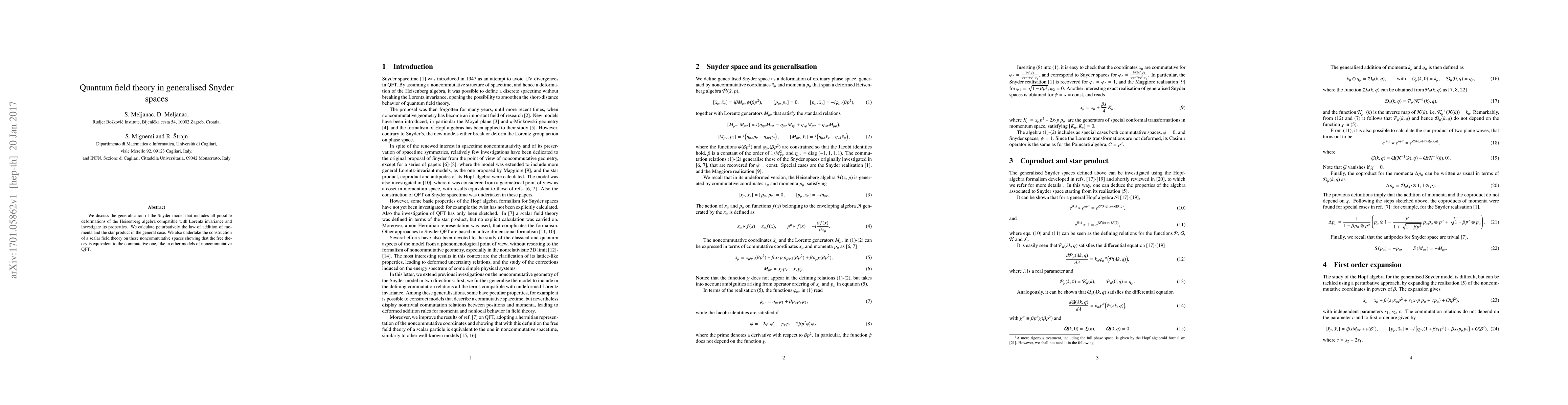 We discuss the generalisation of the Snyder model that includes all possible deformations of the Heisenberg algebra compatible with Lorentz invariance and investigate its properties. We calculate peturbatively the law of addition of momenta and the star product in the general case. We also undertake the construction of a scalar field theory on these noncommutative spaces showing that the free theory is equivalent to the commutative one, like in other models of noncommutative QFT.