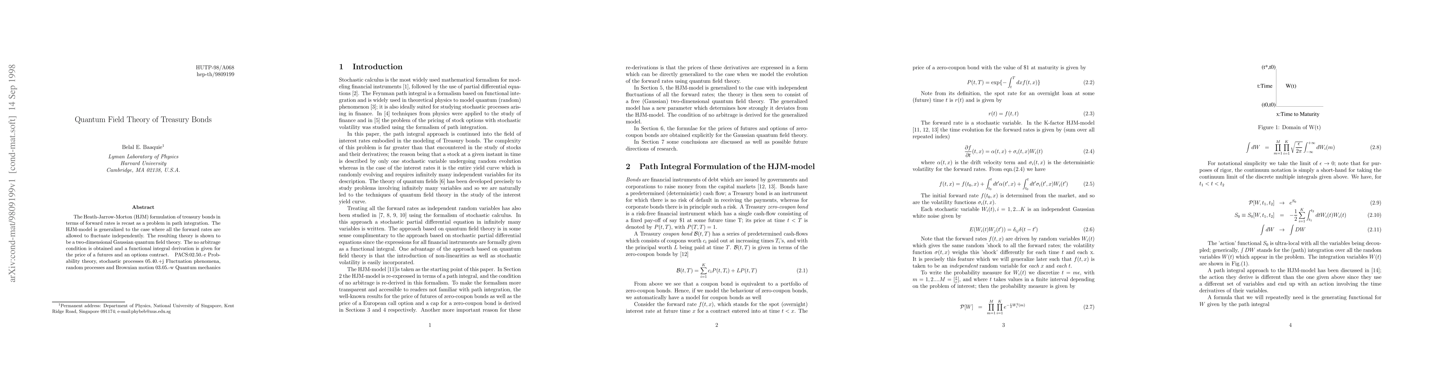 The paper recasts the Heath-Jarrow-Morton (HJM) formulation of treasury bonds using path integration, generalizing the HJM-model to allow all forward rates to fluctuate independently, resulting in a two-dimensional Gaussian quantum field theory.