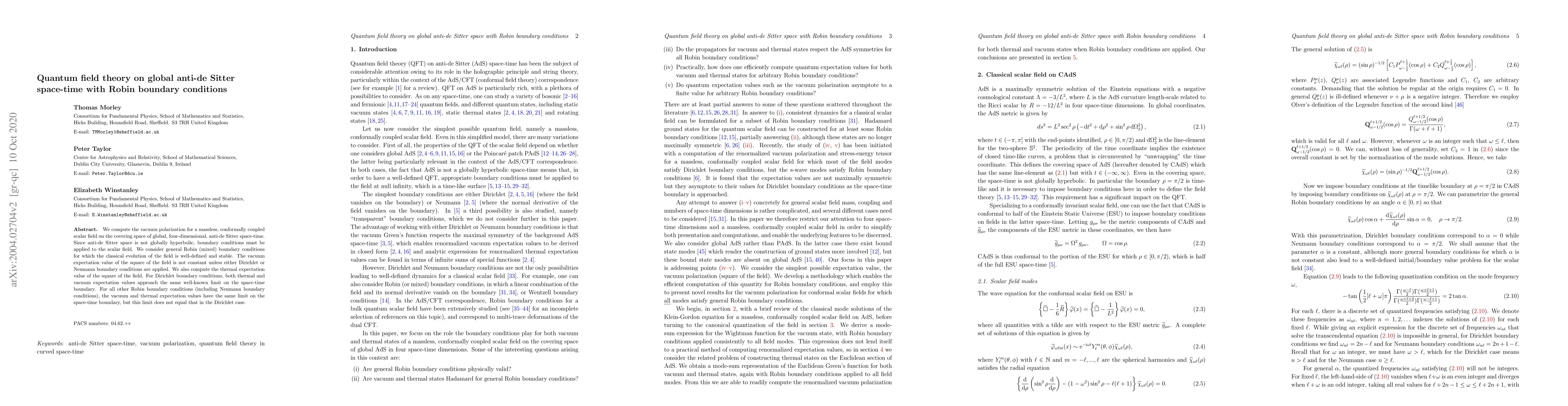 We compute the vacuum polarization for a massless, conformally coupled scalar field on the covering space of global, four-dimensional, anti-de Sitter space-time. Since anti-de Sitter space is not globally hyperbolic, boundary conditions must be applied to the scalar field. We consider general Robin (mixed) boundary conditions for which the classical evolution of the field is well-defined and stable. The vacuum expectation value of the square of the field is not constant unless either Dirichlet or Neumann boundary conditions are applied. We also compute the thermal expectation value of the square of the field. For Dirichlet boundary conditions, both thermal and vacuum expectation values approach the same well-known limit on the space-time boundary conditions. For all other Robin boundary conditions (including Neumann boundary conditions), the vacuum and thermal expectation values have the same limit on the space-time boundary, but this limit does not equal that in the Dirichlet case.