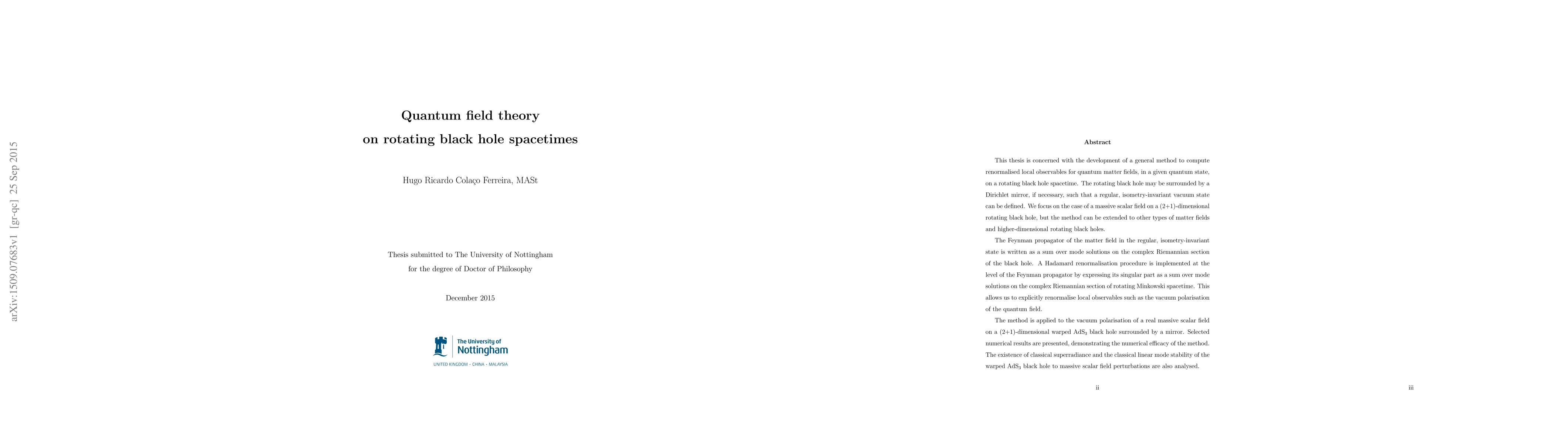 This thesis is concerned with the development of a general method to compute renormalised local observables for quantum matter fields, in a given quantum state, on a rotating black hole spacetime. The rotating black hole may be surrounded by a Dirichlet mirror, if necessary, such that a regular, isometry-invariant vacuum state can be defined. We focus on the case of a massive scalar field on a (2+1)-dimensional rotating black hole, but the method can be extended to other types of matter fields and higher-dimensional rotating black holes. The Feynman propagator of the matter field in the regular, isometry-invariant state is written as a sum over mode solutions on the complex Riemannian section of the black hole. A Hadamard renormalisation procedure is implemented at the level of the Feynman propagator by expressing its singular part as a sum over mode solutions on the complex Riemannian section of rotating Minkowski spacetime. This allows us to explicitly renormalise local observables such as the vacuum polarisation of the quantum field. The method is applied to the vacuum polarisation of a real massive scalar field on a (2+1)-dimensional warped AdS3 black hole surrounded by a mirror. Selected numerical results are presented, demonstrating the numerical efficacy of the method. The existence of classical superradiance and the classical linear mode stability of the warped AdS3 black hole to massive scalar field perturbations are also analysed.
