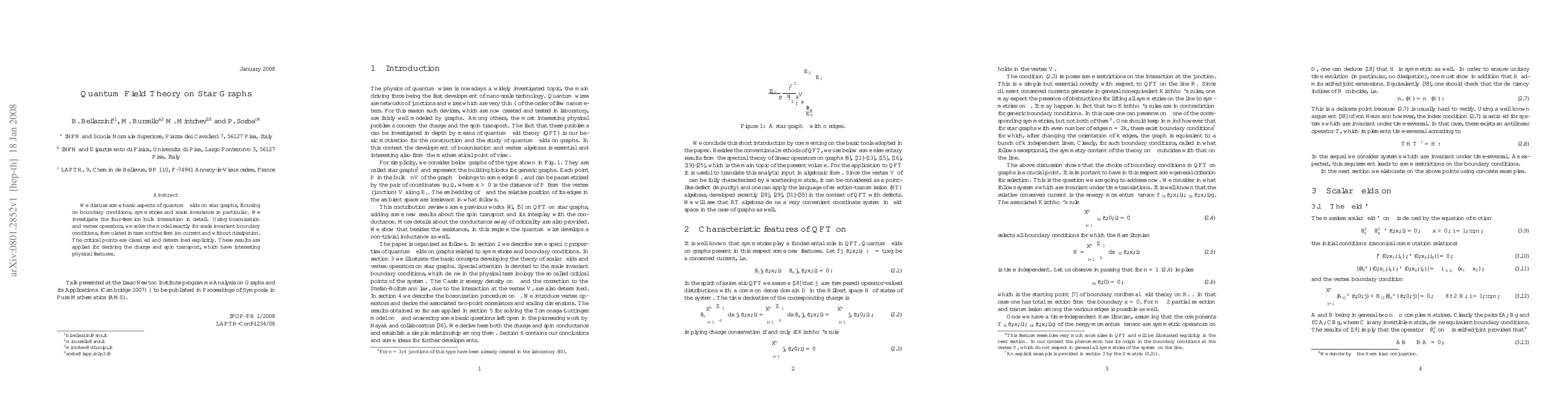 We discuss some basic aspects of quantum fields on star graphs, focusing on boundary conditions, symmetries and scale invariance in particular. We investigate the four-fermion bulk interaction in detail. Using bosonization and vertex operators, we solve the model exactly for scale invariant boundary conditions, formulated in terms of the fermion current and without dissipation. The critical points are classified and determined explicitly. These results are applied for deriving the charge and spin transport, which have interesting physical features.