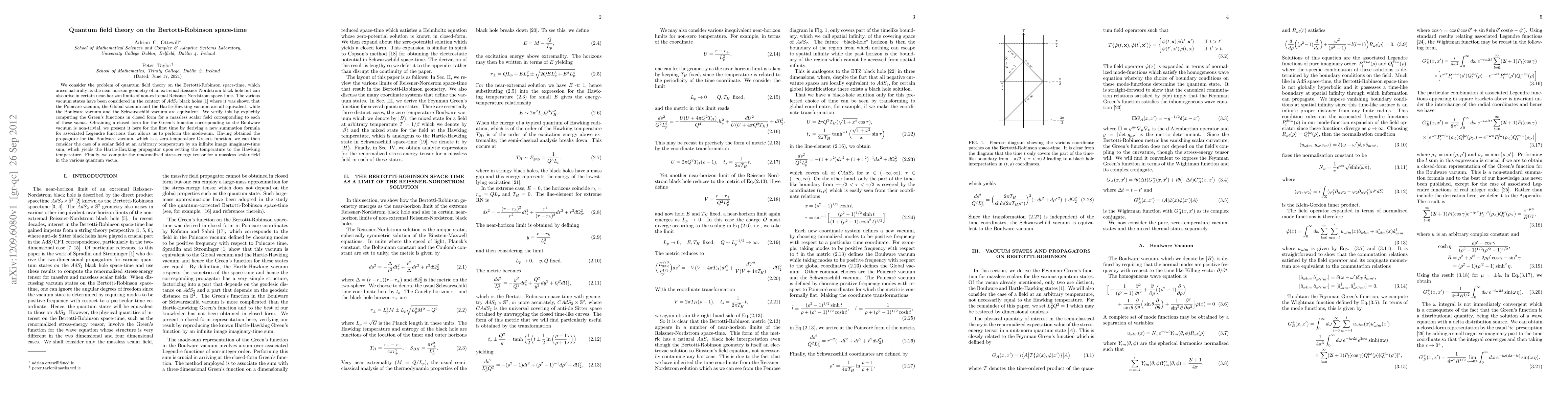 This paper investigates quantum field theory on the Bertotti-Robinson space-time, deriving closed-form Green's functions for various vacua, including the first explicit computation for the Boulware vacuum using a new summation formula. It also computes the renormalized stress-energy tensor for a massless scalar field in these vacua.