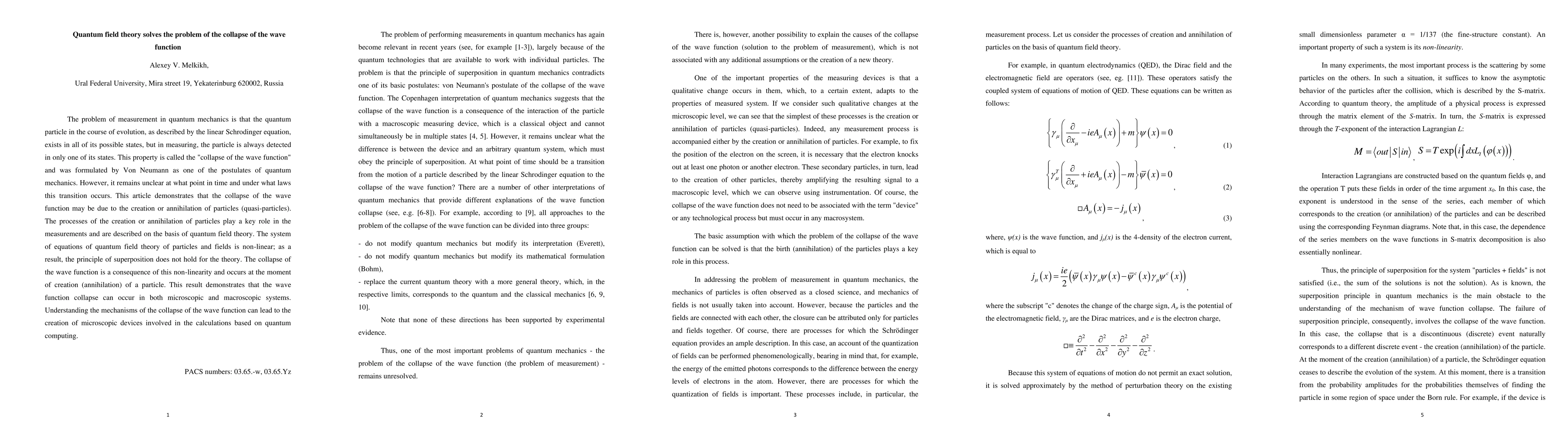 The problem of measurement in quantum mechanics is that the quantum particle in the course of evolution, as described by the linear Schrodinger equation, exists in all of its possible states, but in measuring, the particle is always detected in only one of its states. This property is called the "collapse of the wave function" and was formulated by Von Neumann as one of the postulates of quantum mechanics. However, it remains unclear at what point in time and under what laws this transition occurs. This article demonstrates that the collapse of the wave function may be due to the creation or annihilation of particles (quasi-particles). The processes of the creation or annihilation of particles play a key role in the measurements and are described on the basis of quantum field theory. The system of equations of quantum field theory of particles and fields is non-linear; as a result, the principle of superposition does not hold for the theory. The collapse of the wave function is a consequence of this non-linearity and occurs at the moment of creation (annihilation) of a particle. This result demonstrates that the wave function collapse can occur in both microscopic and macroscopic systems. Understanding the mechanisms of the collapse of the wave function can lead to the creation of microscopic devices involved in the calculations based on quantum computing.