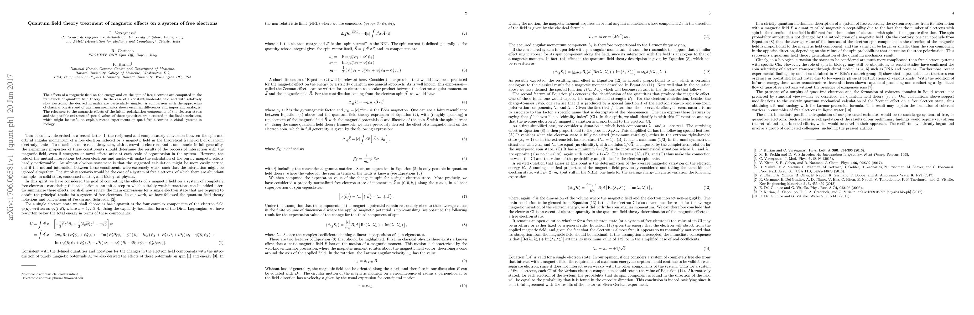 This paper computes quantum field theory effects of a magnetic field on free electron energy and spin, revealing significant differences from classical and quantum mechanical approaches. It discusses the relevance of initial polarization components and special values, which may help explain recent experiments on quasi-free electrons in chiral biological systems.