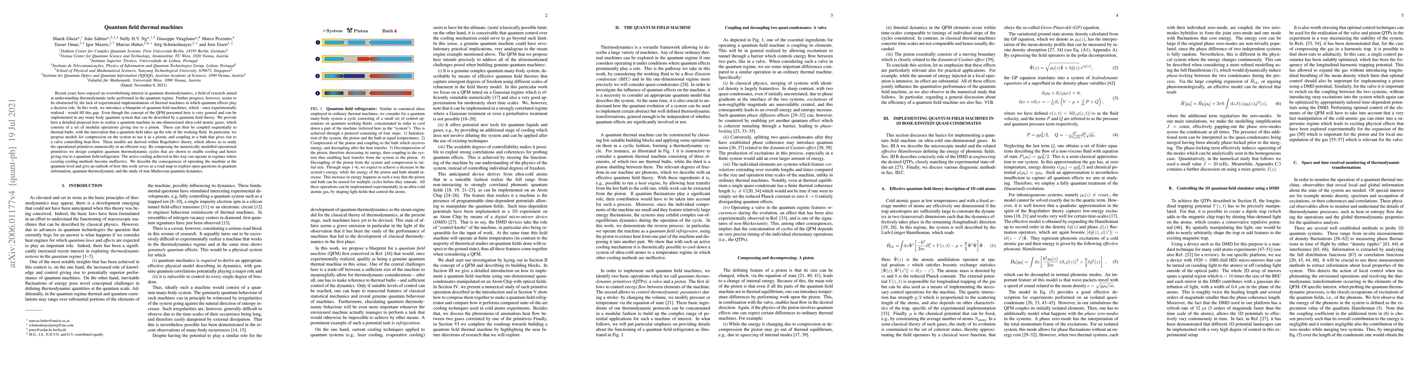 Recent years have enjoyed an overwhelming interest in quantum thermodynamics, a field of research aimed at understanding thermodynamic tasks performed in the quantum regime. Further progress, however, seems to be obstructed by the lack of experimental implementations of thermal machines in which quantum effects play a decisive role. In this work, we introduce a blueprint of quantum field machines, which - once experimentally realized - would fill this gap. Even though the concept of the QFM presented here is very general and can be implemented in any many body quantum system that can be described by a quantum field theory. We provide here a detailed proposal how to realize a quantum machine in one-dimensional ultra-cold atomic gases, which consists of a set of modular operations giving rise to a piston. These can then be coupled sequentially to thermal baths, with the innovation that a quantum field takes up the role of the working fluid. In particular, we propose models for compression on the system to use it as a piston, and coupling to a bath that gives rise to a valve controlling heat flow. These models are derived within Bogoliubov theory, which allows us to study the operational primitives numerically in an efficient way. By composing the numerically modelled operational primitives we design complete quantum thermodynamic cycles that are shown to enable cooling and hence giving rise to a quantum field refrigerator. The active cooling achieved in this way can operate in regimes where existing cooling methods become ineffective. We describe the consequences of operating the machine at the quantum level and give an outlook of how this work serves as a road map to explore open questions in quantum information, quantum thermodynamic and the study of non-Markovian quantum dynamics.