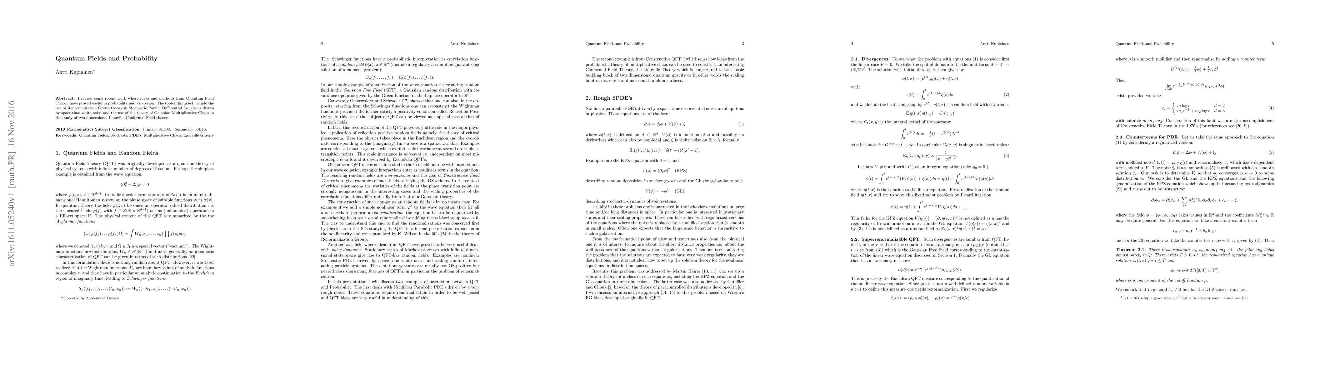 I review some recent work where ideas and methods from Quantum Field Theory have proved useful in probability and vice versa. The topics discussed include the use of Renormalization Group theory in Stochastic Partial Differential Equations driven by space-time white noise and the use of the theory of Gaussian Multiplicative Chaos in the study of two dimensional Liouville Conformal Field theory.