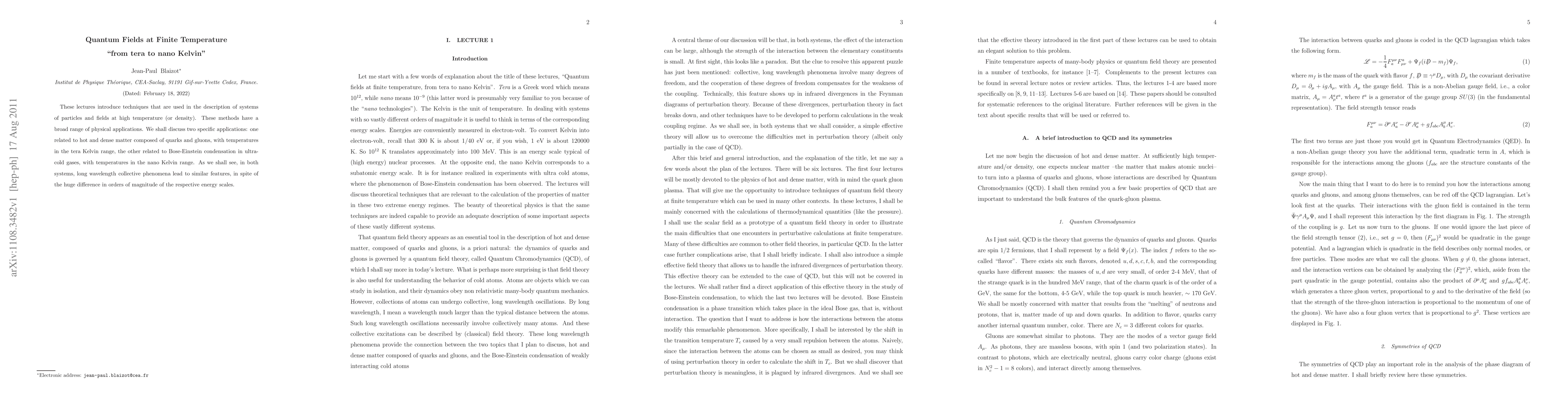 These lectures introduce techniques that are used in the description of systems of particles and fields at high temperature (or density). These methods have a broad range of physical applications. We shall discuss two specific applications: one related to hot and dense matter composed of quarks and gluons, with temperatures in the tera Kelvin range, the other related to Bose-Einstein condensation in ultra-cold gases, with temperatures in the nano Kelvin range. As we shall see, in both systems, long wavelength collective phenomena lead to similar features, in spite of the huge difference in orders of magnitude of the respective energy scales.