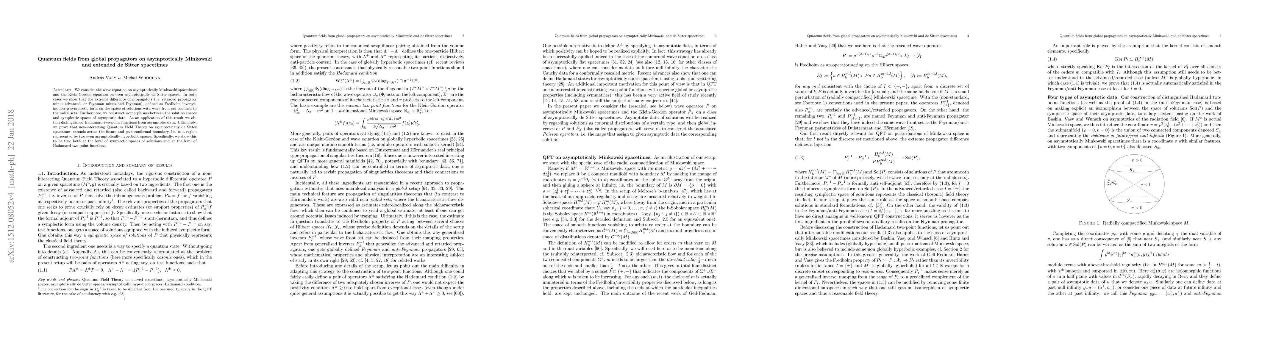 This paper constructs quantum field theories on asymptotically Minkowski and extended de Sitter spacetimes by analyzing the differences in propagators, leading to symplectic forms on solution spaces. It demonstrates that these differences induce canonical quantum field theories on asymptotically hyperbolic spaces, supported by the construction of Hadamard two-point functions from asymptotic data.