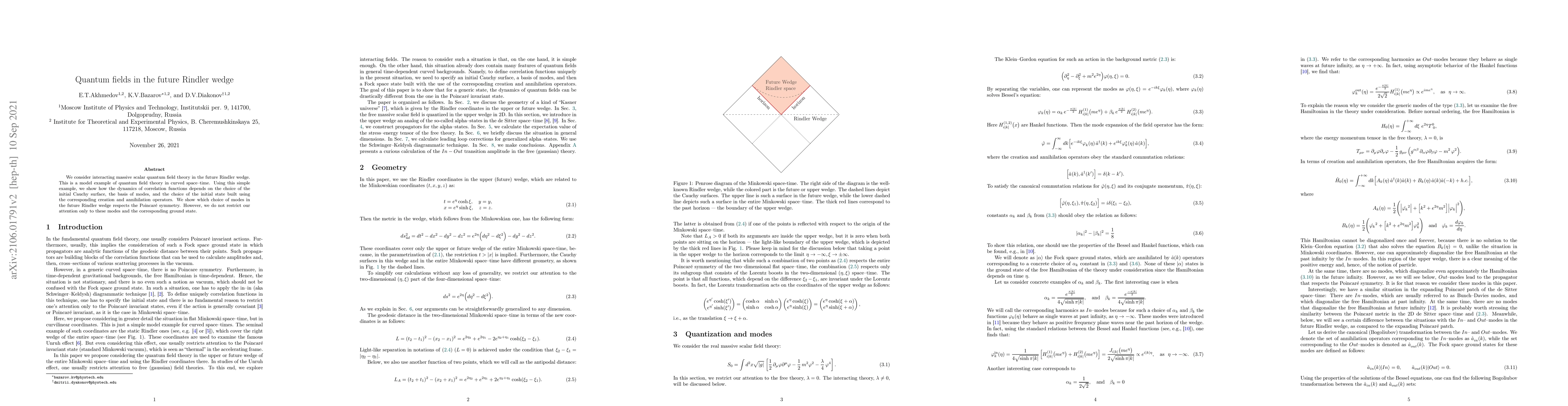 We consider interacting massive scalar quantum field theory in the future Rindler wedge. This is a model example of quantum field theory in curved space--time. On this simple example we show how dynamics of correlation functions depends on the choice of initial Cauchy surface, basis of modes and on the choice of initial state build with the use of the corresponding creation and annihilation operators. We show which choice of modes in the future Rindler wedge respects Poincare symmetry. But we do not restrict our attention only to these modes and the corresponding state.