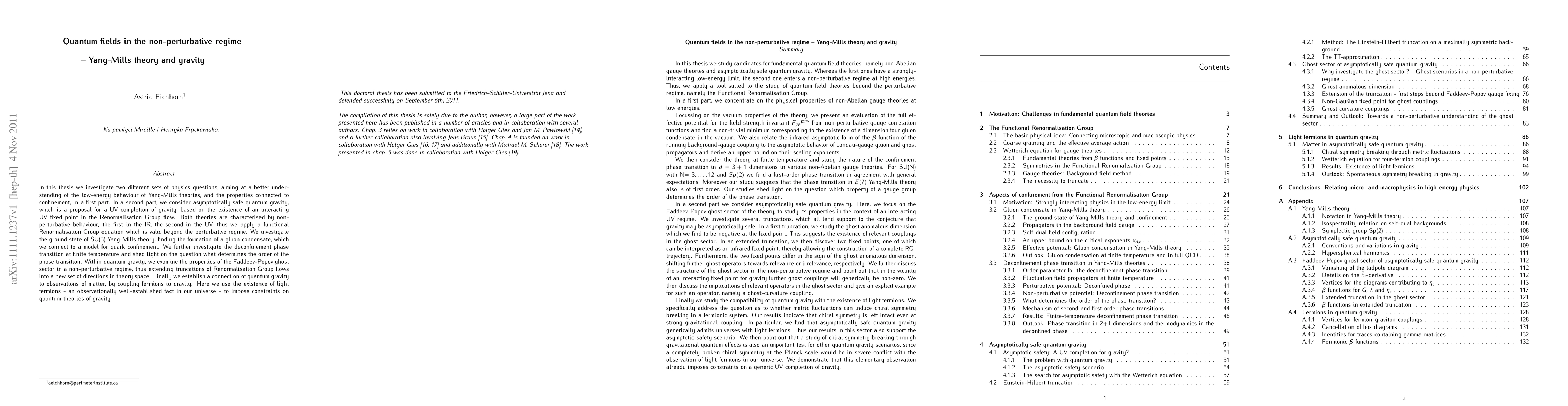 This research explores the non-perturbative regimes of both Yang-Mills theories and quantum gravity using a functional Renormalisation Group approach. It finds a gluon condensate in SU(3) Yang-Mills and examines the deconfinement phase transition, while also investigating the Faddeev-Popov ghost sector in quantum gravity and coupling fermions to gravity to derive observational constraints.