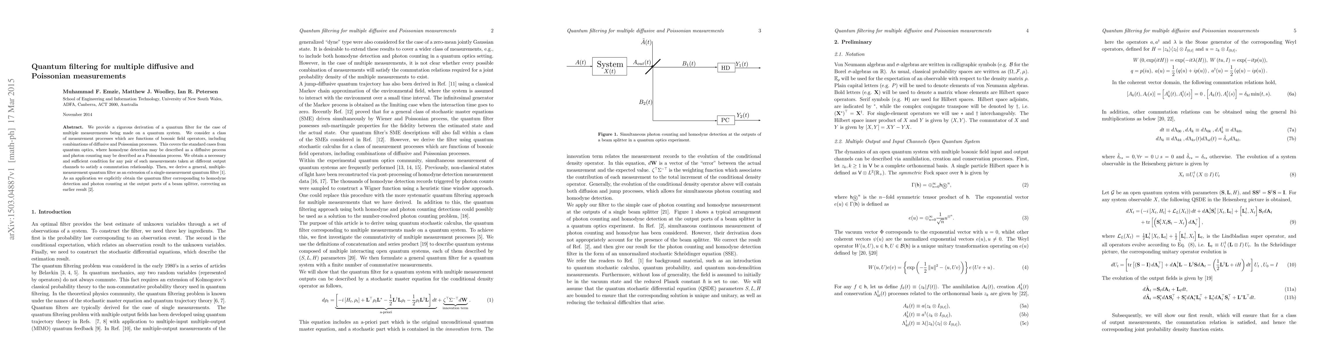 This paper presents a rigorous derivation of a quantum filter for multiple quantum measurements, combining diffusive and Poissonian processes. It provides a necessary and sufficient condition for commutation of different measurements and applies this to correct a previous result on homodyne detection and photon counting at beam splitter outputs.