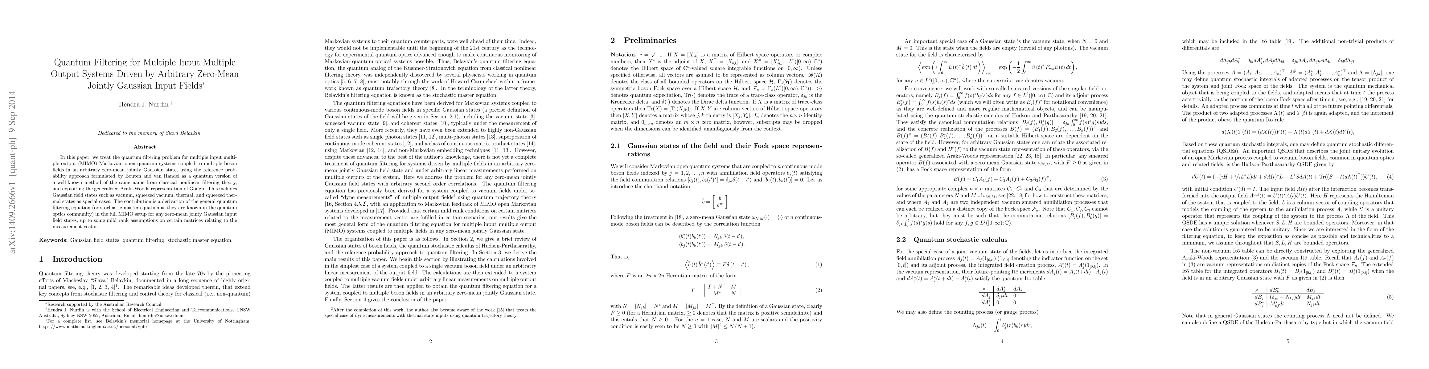 This paper develops a quantum filtering framework for multiple input multiple output systems driven by arbitrary zero-mean jointly Gaussian input fields, enabling precise measurement of noisy quantum states.