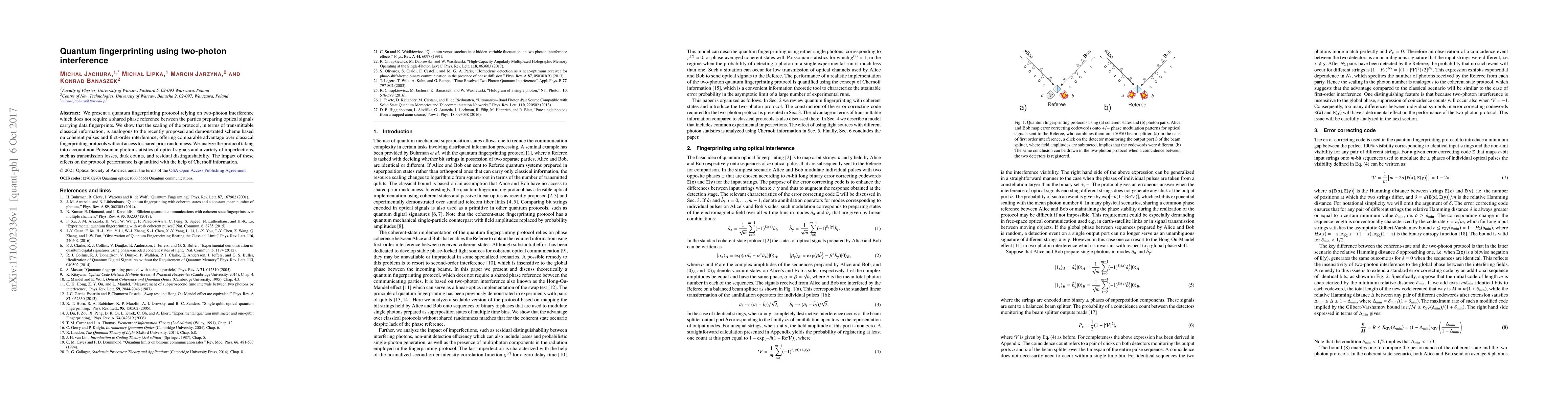 This paper introduces a quantum fingerprinting protocol based on two-photon interference, eliminating the need for a shared phase reference. It demonstrates comparable efficiency to schemes using coherent pulses, while accounting for non-ideal conditions like photon statistics and various imperfections, and evaluates their impact using Chernoff information.