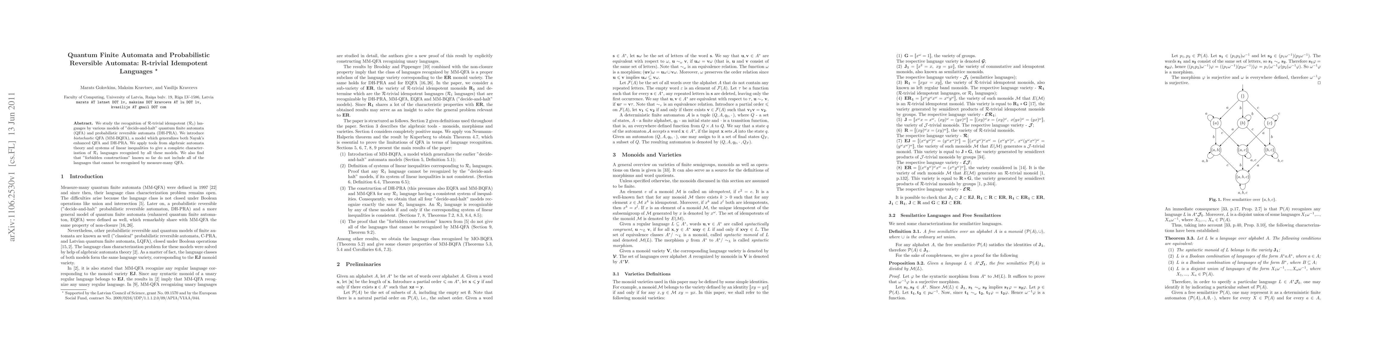 This paper investigates the recognition of R-trivial idempotent languages by quantum finite automata and probabilistic reversible automata, introducing a new generalized model called bistochastic QFA. It provides a complete characterization of these languages using algebraic automata theory and linear inequalities, revealing that existing "forbidden constructions" do not cover all non-recognizable languages by measure-many quantum finite automata.