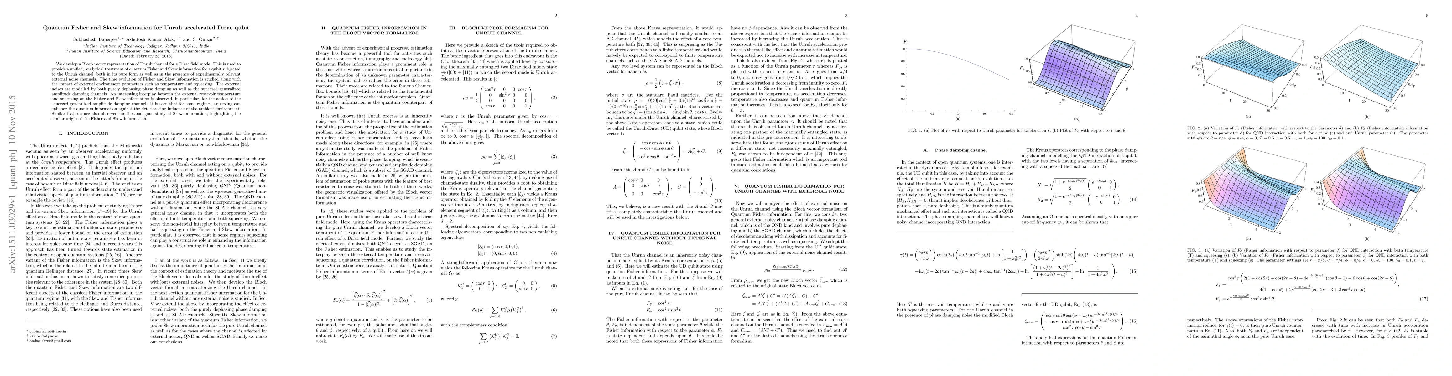 We develop a Bloch vector representation of Unruh channel for a Dirac field mode. This is used to provide a unified, analytical treatment of quantum Fisher and Skew information for a qubit subjected to the Unruh channel, both in its pure form as well as in the presence of experimentally relevant external noise channels. The time evolution of Fisher and Skew information is studied along with the impact of external environment parameters such as temperature and squeezing. The external noises are modelled by both purely dephasing phase damping as well as the squeezed generalized amplitude damping channels. An interesting interplay between the external reservoir temperature and squeezing on the Fisher and Skew information is observed, in particular, for the action of the squeezed generalized amplitude damping channel. It is seen that for some regimes, squeezing can enhance the quantum information against the deteriorating influence of the ambient environment. Similar features are also observed for the analogous study of Skew information, highlighting the similar origin of the Fisher and Skew information.