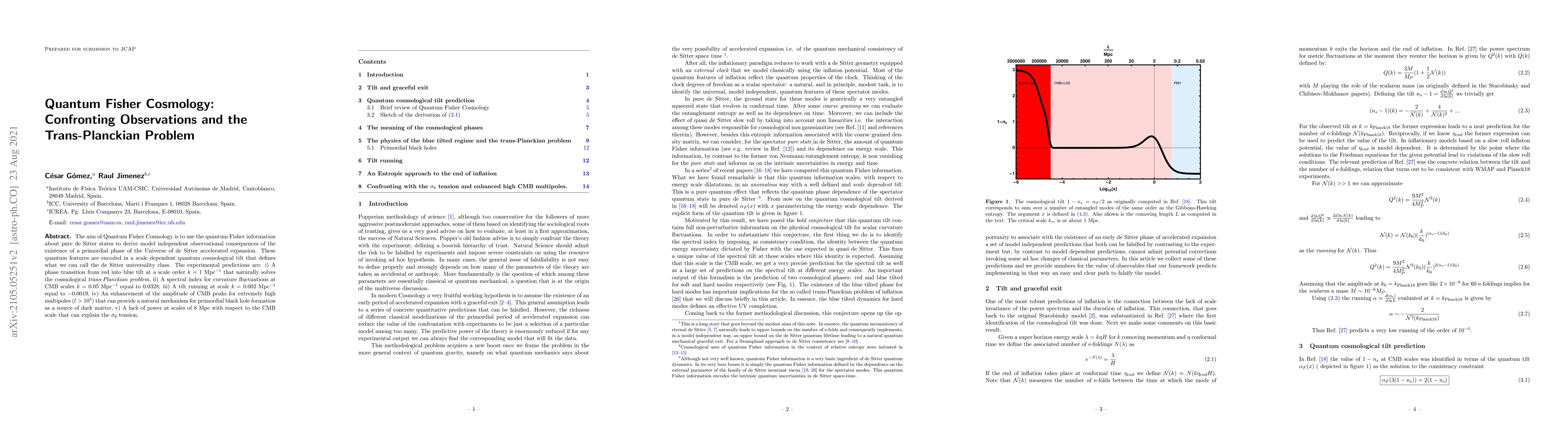 The aim of Quantum Fisher Cosmology is to use the quantum Fisher information about pure de Sitter states to derive model independent observational consequences of the existence of a primordial phase of the Universe of de Sitter accelerated expansion. These quantum features are encoded in a scale dependent quantum cosmological tilt that defines what we can call the de Sitter universality class. The experimental predictions are: i) A phase transition from red into blue tilt at a scale order $k= 1$ Mpc$^{-1}$ that naturally solves the cosmological trans-Planckian problem, ii) A spectral index for curvature fluctuations at CMB scales $k= 0.05$ Mpc$^{-1}$ equal to $0.0328$, iii) A tilt running at scale $k=0.002$ Mpc$^{-1}$ equal to $-0.0019$, iv) An enhancement of the amplitude of CMB peaks for extremely high multipoles ($l > 10^5$) that can provide a natural mechanism for primordial black hole formation as a source of dark matter, v) A lack of power at scales of $8$ Mpc with respect to the CMB scale that can explain the $\sigma_8$ tension.