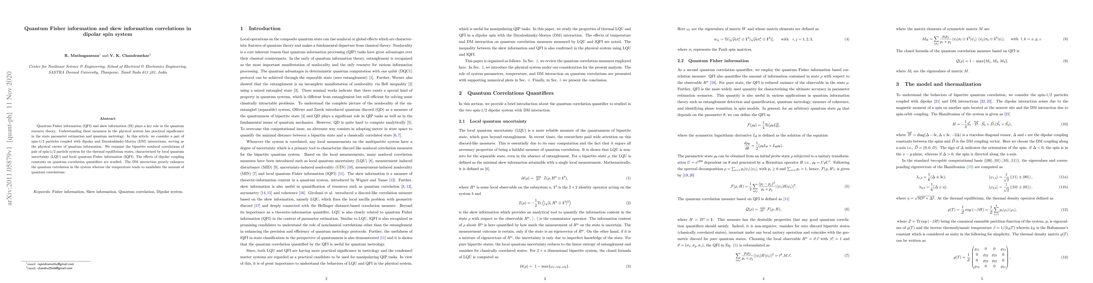 This paper investigates quantum Fisher information and skew information correlations in a spin-1/2 particle system with dipolar and Dzyaloshinsky-Moriya interactions. It finds that the Dzyaloshinsky-Moriya interaction significantly enhances quantum correlations, while thermal effects diminish them.