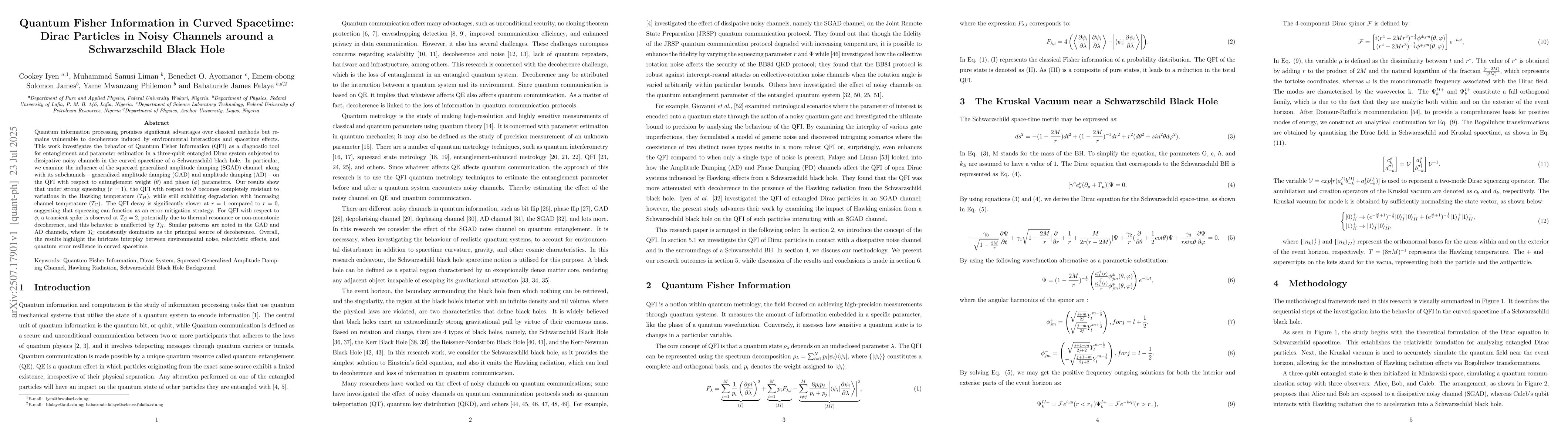 Quantum information processing promises significant advantages over classical methods but remains vulnerable to decoherence induced by environmental interactions and spacetime effects. This work investigates the behavior of Quantum Fisher Information (QFI) as a diagnostic tool for entanglement and parameter estimation in a three-qubit entangled Dirac system subjected to dissipative noisy channels in the curved spacetime of a Schwarzschild black hole. In particular, we examine the influence of the squeezed generalized amplitude damping (SGAD) channel, along with its subchannels -- generalized amplitude damping (GAD) and amplitude damping (AD) -- on the QFI with respect to entanglement weight ($\theta$) and phase ($\phi$) parameters. Our results show that under strong squeezing ($r = 1$), the QFI with respect to $\theta$ becomes completely resistant to variations in the Hawking temperature ($T_H$), while still exhibiting degradation with increasing channel temperature ($T_C$). The QFI decay is significantly slower at $r = 1$ compared to $r = 0$, suggesting that squeezing can function as an error mitigation strategy. For QFI with respect to $\phi$, a transient spike is observed at $T_C = 2$, potentially due to thermal resonance or non-monotonic decoherence, and this behavior is unaffected by $T_H$. Similar patterns are noted in the GAD and AD channels, where $T_C$ consistently dominates as the principal source of decoherence. Overall, the results highlight the intricate interplay between environmental noise, relativistic effects, and quantum error resilience in curved spacetime.