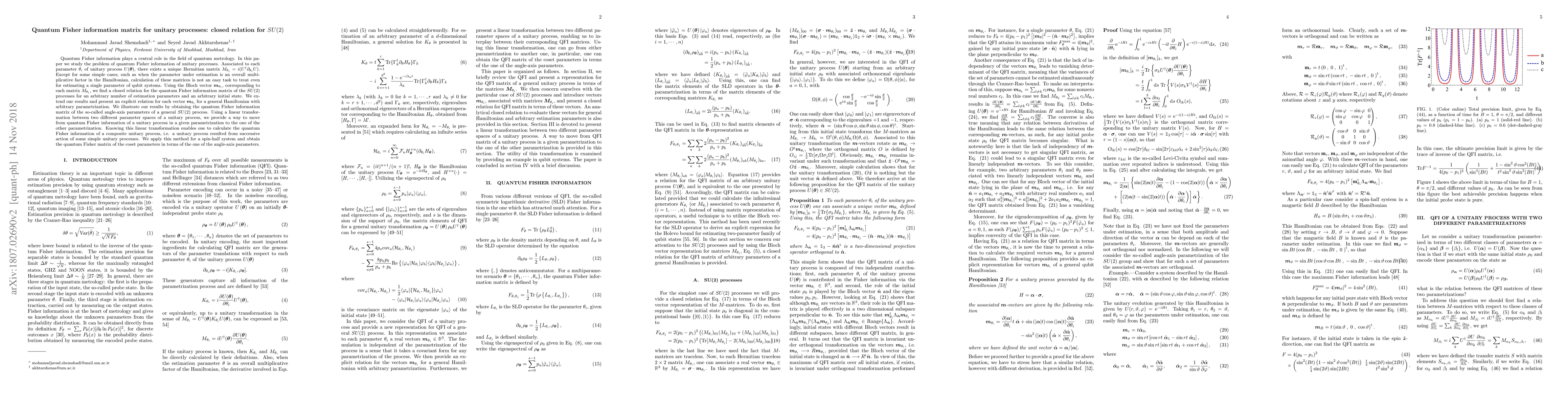 This paper investigates the quantum Fisher information matrix for unitary processes in $SU(2)$ systems, deriving a closed relation for arbitrary estimation parameters and initial states. It provides a method to transition between different parameterizations of unitary processes and applies this to calculate the quantum Fisher information matrix for spin-half systems.