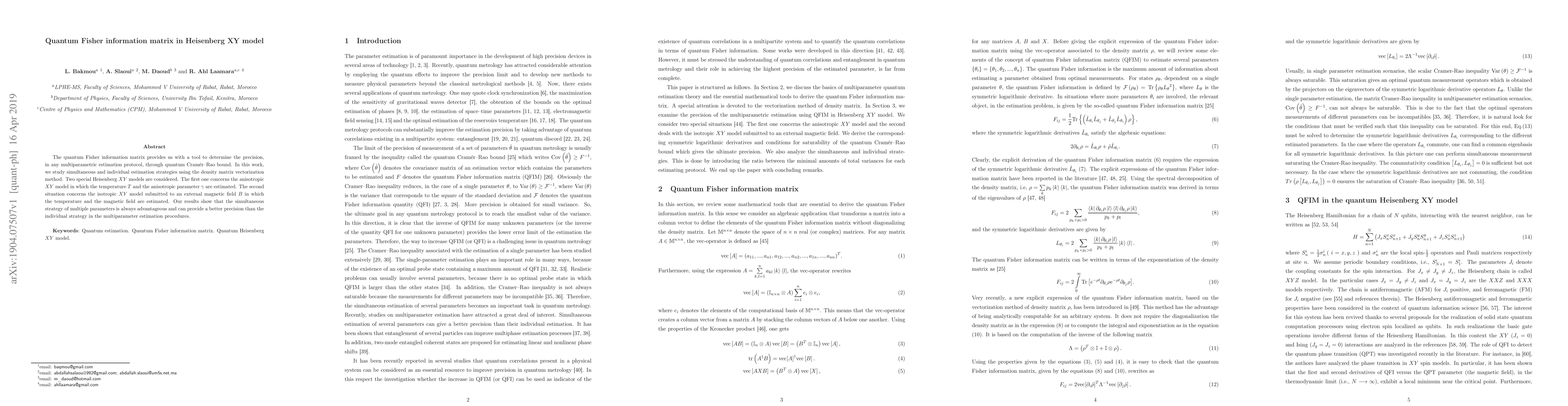 This paper investigates the quantum Fisher information matrix for multiparameter estimation in two Heisenberg XY models, demonstrating that simultaneous estimation strategies yield higher precision compared to individual strategies. The study focuses on anisotropic and isotropic XY models, estimating temperature, anisotropic parameters, and magnetic fields.