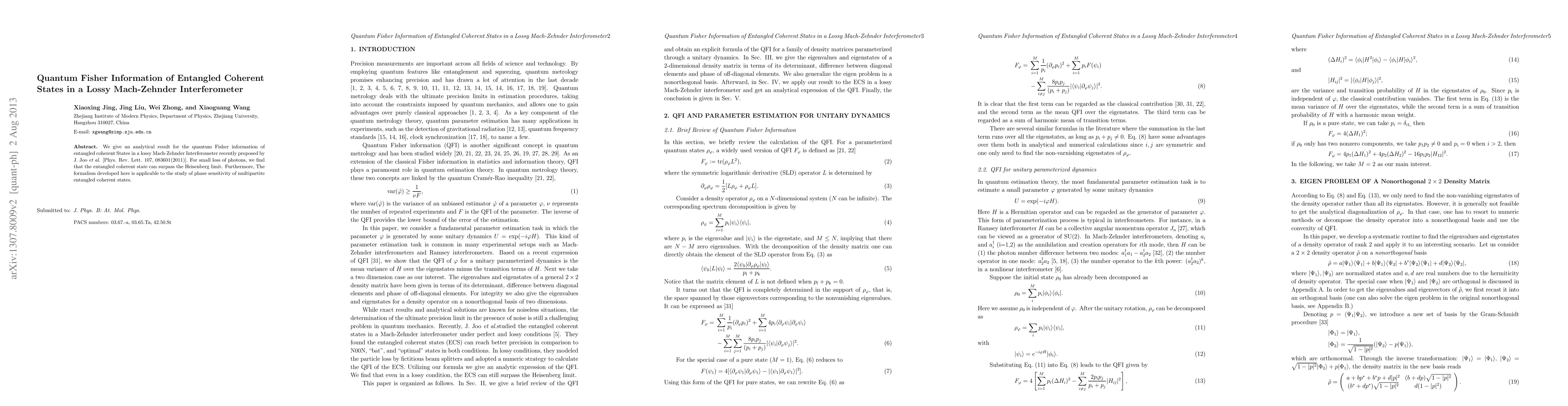 This paper provides an analytical result for the quantum Fisher information of entangled coherent states in a lossy Mach-Zehnder interferometer, showing that for small photon loss, these states can exceed the Heisenberg limit. The developed formalism is also applicable to studying the phase sensitivity of multipartite entangled coherent states.